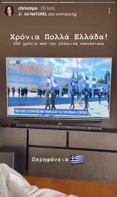 «Σήμερα είναι μια πολύ ξεχωριστή ημέρα. Γιορτάζουμε την επέτειο της εθνικής παλιγγενεσίας της 25ης Μαρτίου 1821, η οποία συμπίπτει με την συμπλήρωση 200 ετών από την ελληνική επανάσταση. «Θέλει αρετήν και τόλμην η ελευθερία», όπως πολύ σωστά έλεγε ο μεγάλος ποιητής μας, Ανδρέας Κάλβος. Και ευτυχώς για εμάς, οι πρόγονοί μας διέθεταν και τα δύο σε περίσσεια. Όπως η Λασκαρίνα Μπουμπουλίνα, που καταγόταν από την Ύδρα και έζησε στο νησί μου, τις Σπέτσες. Φέτος, παρά τους πολλούς επίσημους προσκεκλημένους, λόγω της πανδημίας, δεν θα μπορέσουμε να γιορτάσουμε αυτή την ιστορική επέτειο των 200 ετών με την μεγαλοπρέπεια που θα θέλαμε. Αυτό δεν θα μας εμποδίσει, όμως, να αποτίσουμε φόρο τιμής στους ήρωες που θυσίασαν τα πάντα για την ελευθερία της πατρίδας μας. Ούτε, βέβαια, και να νιώσουμε ευγνώμονες που χάρη σε εκείνους απολαμβάνουμε εμείς την ελευθερία μας, αλλά και να αισθανθούμε βαθιά υπερήφανοι που είμαστε Έλληνες! Χρόνια Πολλά σε όλες και όλους!», έγραψε στη λεζάντα της φωτογραφίας
