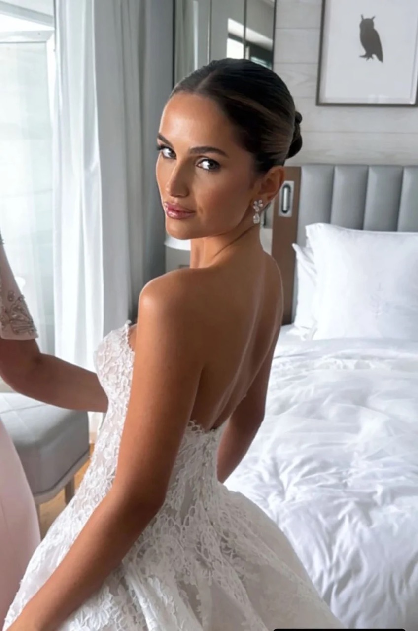 Η νύφη, μόλις 24 ετών, εντυπωσίασε με το στράπλες ολοκέντητο νυφικό της και τα διακριτικά κοσμήματα που επέλεξε. Τα μαλλιά της ήταν αρχικά πιασμένα σε έναν κομψό κότσο και στη συνέχεια τα άφησε ελεύθερα, προσδίδοντας μια αίσθηση χαλαρότητας και κομψότητας στην εμφάνισή της.
