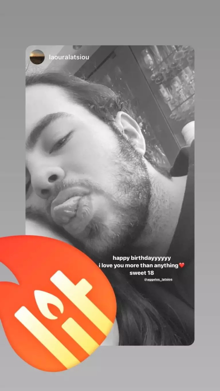 Η μικρότερη αδερφή του και δεύτερο παιδί της Ελένης Μενεγάκη και του Γιάννη Λάτσιου, θέλησε να ευχηθεί στον αδερφό της μέσω Instagram, αναρτώντας μια selfie τους. «Happy birthday. I love you more than anything. Sweet 18 (χρόνια πολλά. Σε αγαπώ πιο πολύ από καθετί. Γλυκά 18») έγραψε η 15χρονη Λάουρα.