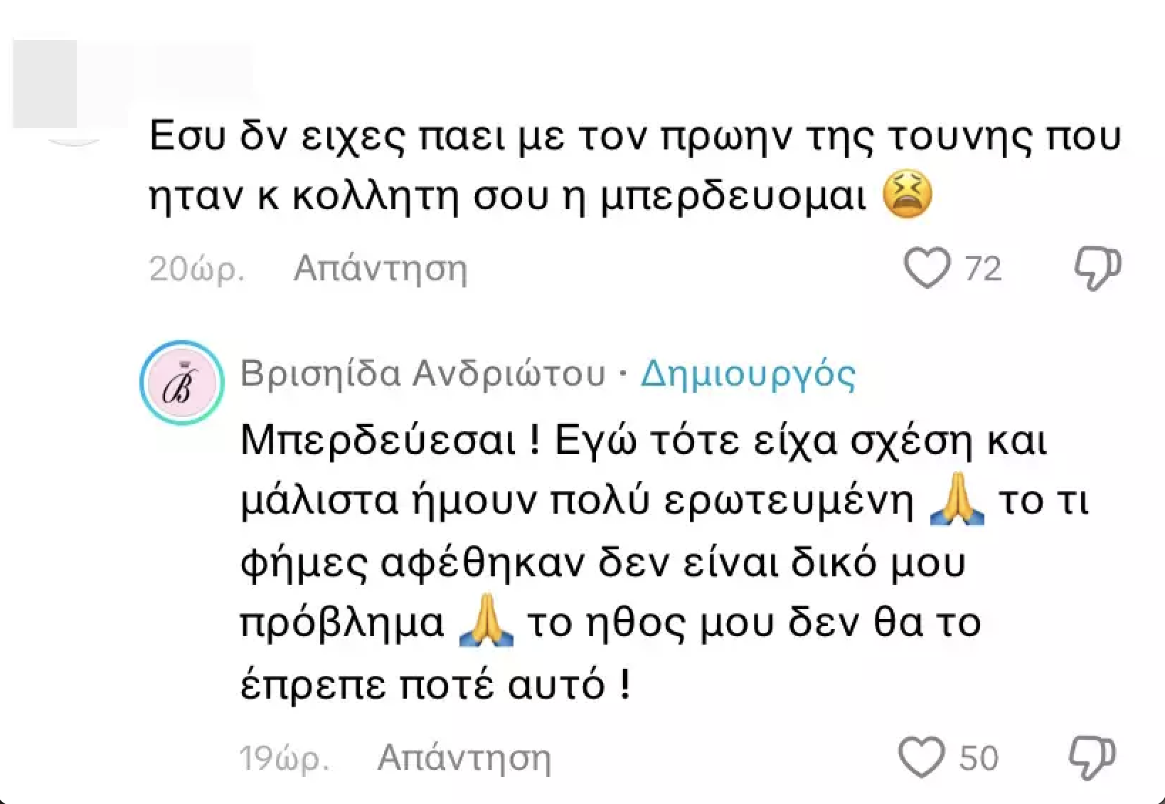 Το βίντεο της Βρισηίδας Ανδριώτου προκάλεσε πολλές αντιδράσεις, και μεταξύ των αμέτρητων σχολίων, υπήρξε ένα που την κατηγόρησε για συμπεριφορά παρόμοια με εκείνη που είχε προς την πρώην φίλη της, Ιωάννα Τούνη, όταν ήταν κοντά. Παρά την ένταση που δημιούργησε το σχόλιο, η Βρισηίδα αποφάσισε να απαντήσει για να ξεκαθαρίσει τη θέση της και να αντιμετωπίσει την κριτική.