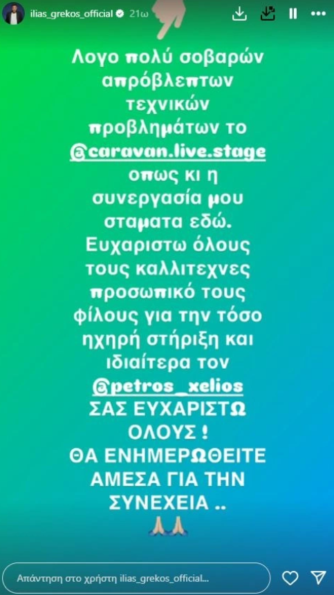 «Λόγω πολύ σοβαρών απρόβλεπτων τεχνικών προβλημάτων το Caravan Live Stage όπως και η συνεργασία μου σταματά εδώ. Ευχαριστώ όλους τους καλλιτέχνες προσωπικά, τους φίλους για την τόσο ηχηρή στήριξη και ιδιαίτερα τον @petros_xelios. Σας ευχαριστώ όλους! Θα ενημερωθείτε άμεσα για τη συνέχεια», έγραψε χαρακτηριστικά ο τραγουδιστής.