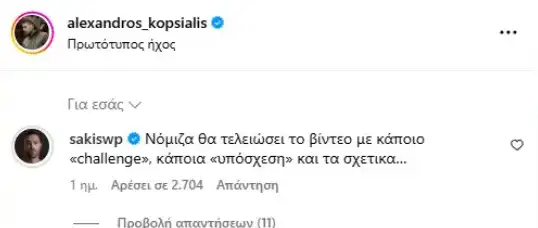 Η ανάρτησή του Αλέξανδρου Κοψιάλη συγκέντρωσε εκατοντάδες σχόλια από followers και φίλους του, ανάμεσά τους και από τον Σάκη Τανιμανίδη, ο οποίος σχολίασε χαρακτηριστικά: «Νόμιζα θα τελειώσει το βίντεο με κάποιο “challenge”, κάποια “υπόσχεση” και τα σχετικά».
