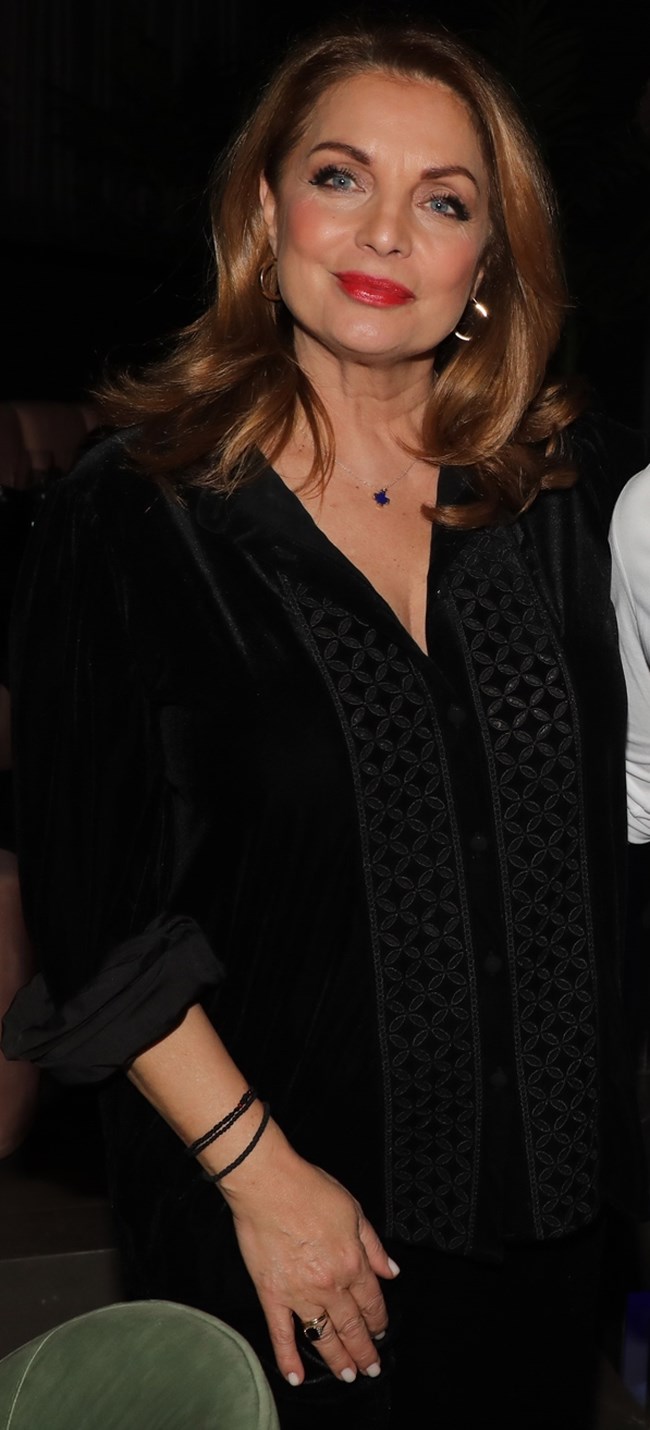 Η 65χρονη επέλεξε ένα βελούδινο σύνολο με μαύρο τοπ με γιακά μάο και ασορτί παντελόνι.