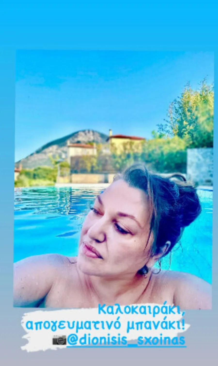 Κατά τη διάρκεια της φετινής καλοκαιρινής απόδρασης, το ζευγάρι αναδεικνύει στιγμές ευχαρίστησης και χαλάρωσης, ανακτώντας δυνάμεις. Στην πρόσφατη δημοσίευση της Καίτης Γαρμπή, η οποία καταγράφηκε και από τον Διονύση Σχοινά, την βλέπουμε να απολαμβάνει την απογευματινή της βουτιά στην πισίνα. Στην φωτογραφία, η Καίτη εμφανίζεται χωρίς μακιγιάζ και με τα μαλλιά της πιασμένα ψηλά, ποζάροντας ανέμελα. Το στιγμιότυπο δημοσιεύτηκε στο Instagram Story της με την λεζάντα: «Καλοκαιράκι, απογευματινό μπανάκι».