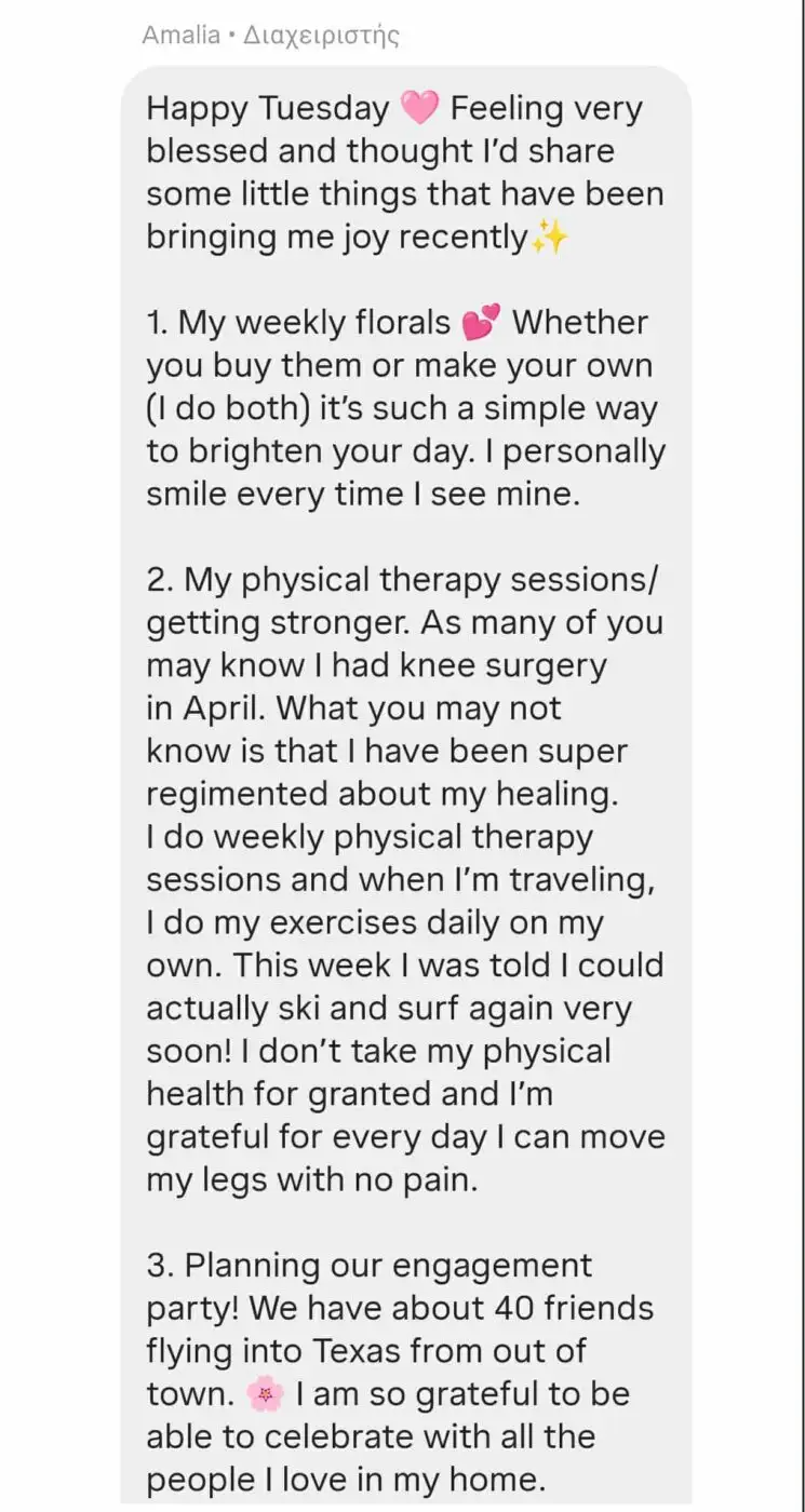 «Νιώθω πολύ ευλογημένη και σκέφτηκα ότι θα ήθελα να μοιραστώ μερικά μικρά πράγματα που μου φέρνουν χαρά τις τελευταίες ημέρες» γράφει αρχικά η Αμαλία Κωστοπούλου, αποκαλύπτοντας στο τέλος πως «Διοργανώνω το πάρτι αρραβώνων μου! Έχουμε περίπου 40 φίλους που θα πετάξουν στο Τέξας από άλλα μέρη. Είμαι τόσο ευγνώμων που θα μπορέσω να το γιορτάσω με όλους τους ανθρώπους που αγαπώ στο σπίτι μου».
