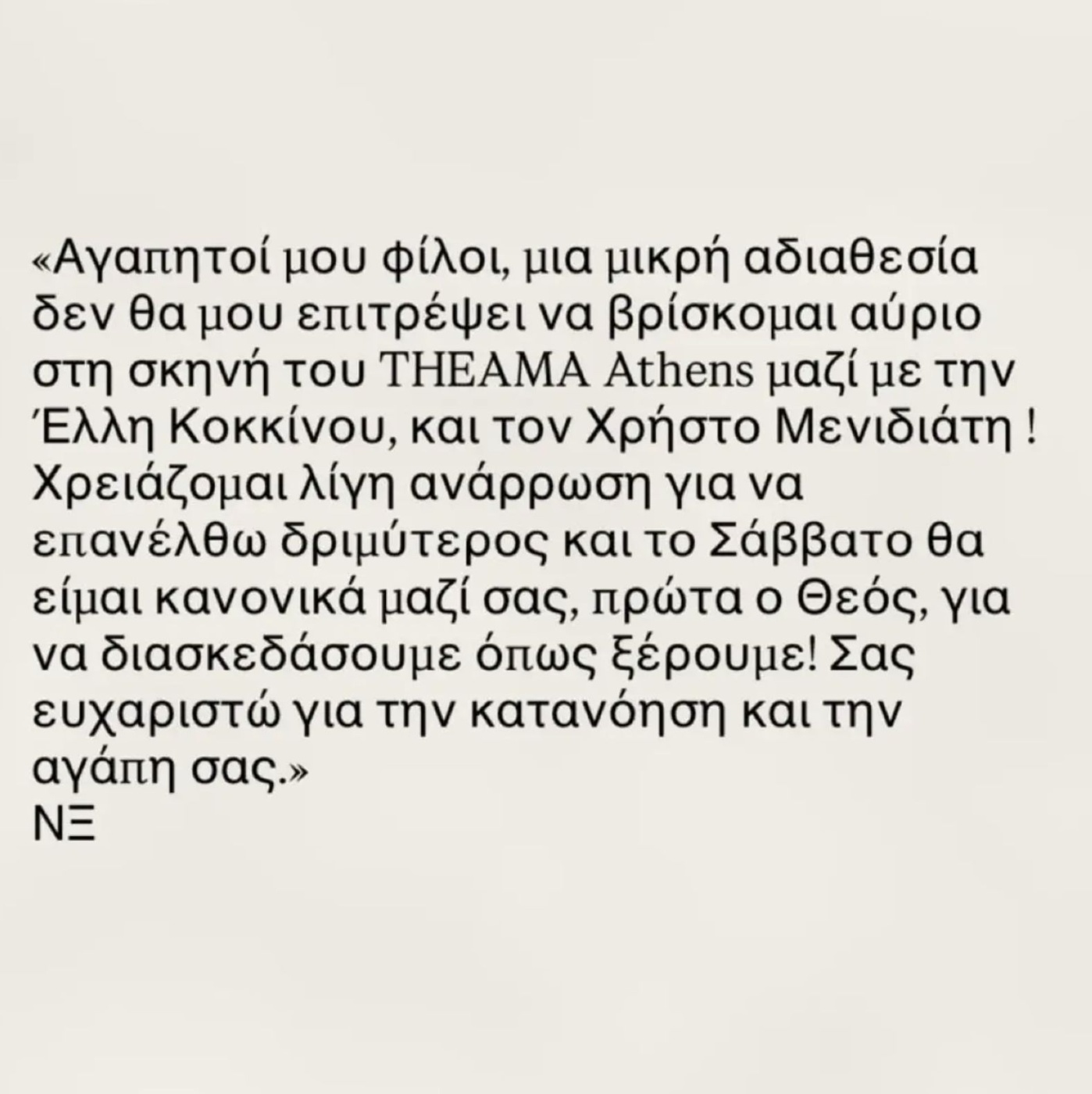 «Αγαπητοί φίλοι, μια μικρή αδιαθεσία δε θα μου επιτρέψει να βρίσκομαι αύριο στη σκηνή του THEAMA Athens μαζί με την Έλλη Κοκκίνου και τον Χρήστο Μενιδιάτη!