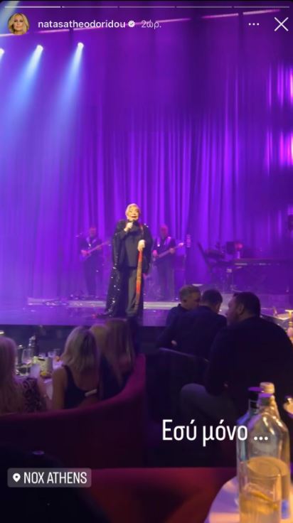 Μια βραδινή έξοδο έκαναν η Νατάσα Θεοδωρίδου και ο Άγγελος Λάτσιος, οι οποίοι παρακολούθησαν τη Μαρινέλλα, τη Μπέττυ Μαγγίρα και τον Στέλιο Διονυσίου. Η τραγουδίστρια και το βαφτιστήρι της, γιος της φίλης και κουμπάρας της, Ελένης Μενεγάκη, δεν σταμάτησαν να ανεβάζουν υλικό στα social media.