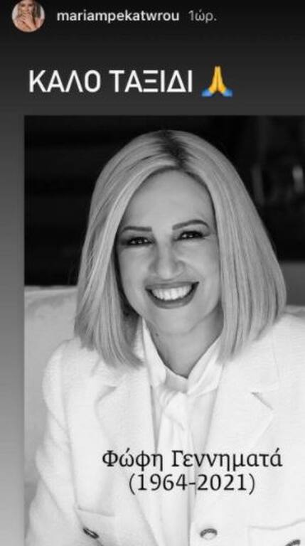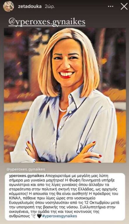 «Σήμερα 25/10/2021 και ώρα 12:04 μ.μ. στο Νοσοκομείο Ευαγγελισμός, απεβίωσε η πρόεδρος του ΚΙΝΑΛ Φώφη Γεννηματά μετά από πολυετή μάχη και παρά τις προσπάθειες των θεραπόντων ιατρών. Εκφράζουμε τα θερμά μας συλλυπητήρια στους οικείους της».