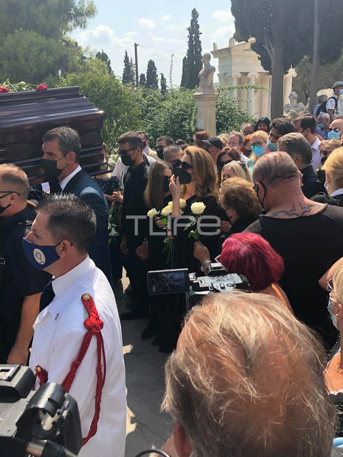 Η Άντζελα Γκερέκου, η «γαλανομάτα μάγισσα» του Τόλη Βοσκόπουλου και η 20χρονη κόρη του, Μαρία Βοσκοπούλου, κρατώντας η μία την άλλη, δε μπόρεσαν να κρύψουν τη συγκίνησή τους. Λίγο μετά τις 2 το μεσημέρι, έφτασαν στο Α’ Νεκροταφείο συντετριμμένες.