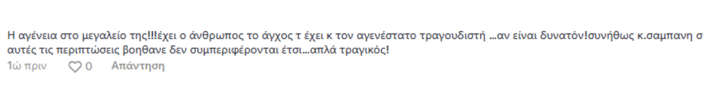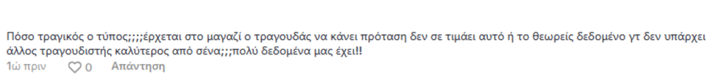 Τα σχόλια κάτω από το βίντεο κατακρίνουν τη συμπεριφορά του καλλιτέχνη, τονίζοντας πόσο αγενής είναι. Κάποιος σημείωσε μάλιστα, πως συνήθως σε τέτοιες περιπτώσεις, ο τραγουδιστής φροντίζει να βοηθήσει τον άλλο και όχι να τον αγχώσει.