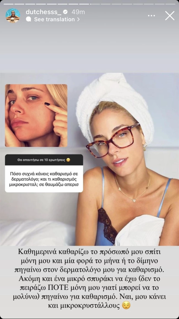 Σε πρόσφατο Q&A ωστόσο που οργάνωσε στο προφίλ της, δέχτηκε μια ερώτηση σχετικά με το κάθε πότε κάνει καθαρισμό στο ιατρείο αλλά και τι είδους καθαρισμό προτιμά. Η Δούκισσα απάντησε ότι δεν αρκείται στο καθαρισμό που κάνει μόνη της καθημερινά στο σπίτι (που, μεταξύ μας, είναι απαραίτητος και πρέπει να γίνεται από όλες μας αν θέλουμε καθαρή επιδερμίδα) αλλά επισκέπτεται τον γιατρό της κάθε δύο μήνες, ακόμα και μια φορά τον μήνα σε κάποιες περιπτώσεις, για επαγγελματικό καθαρισμό στο ιατρείο.