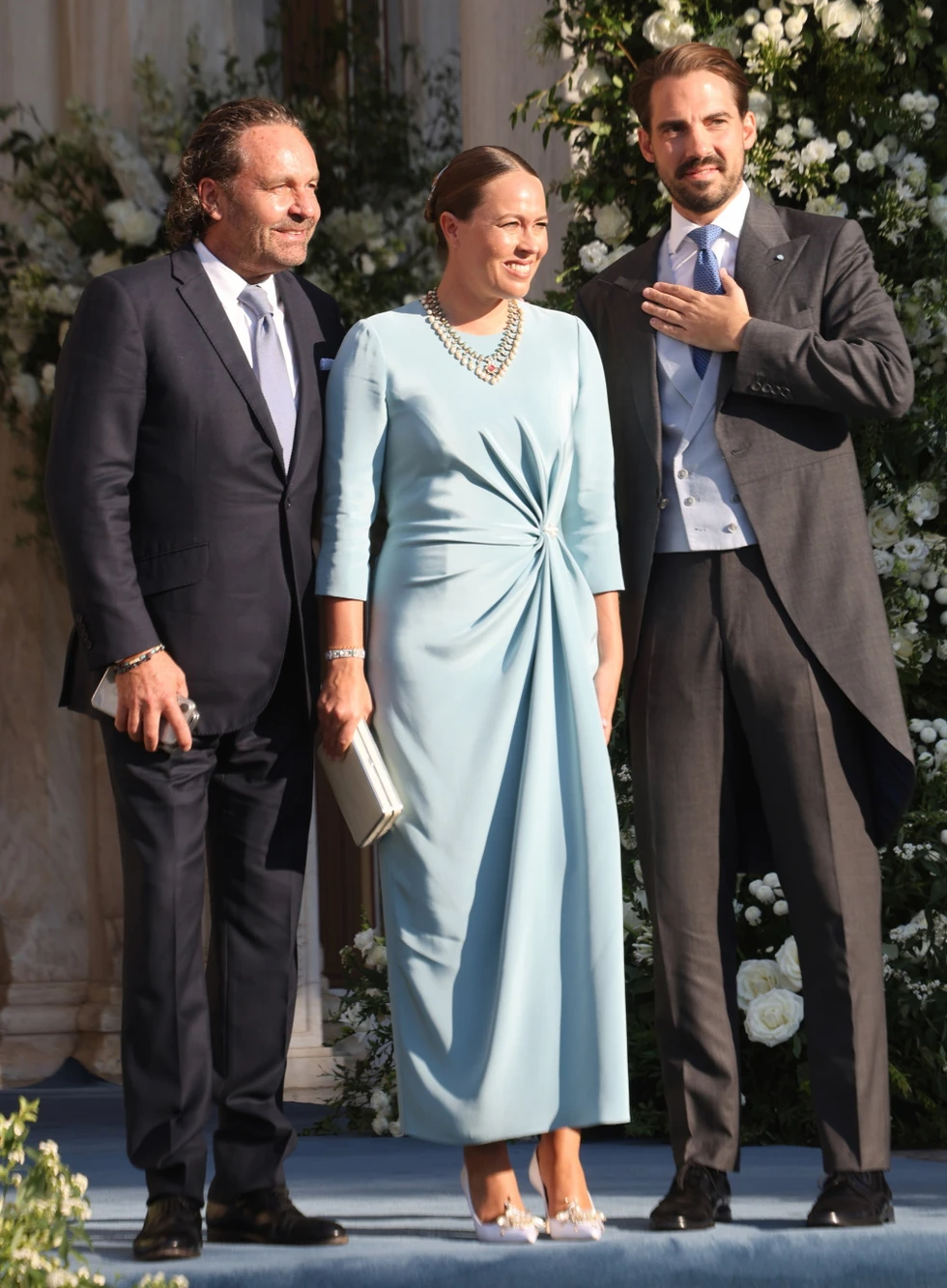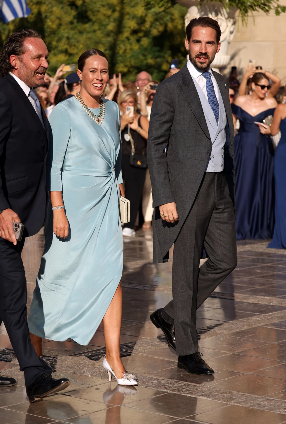 Για την εμφάνισή της, η σύζυγος του Φίλιππου επέλεξε να φορέσει ένα κρεπ baby blue κομψό φόρεμα με ντραπέ στοιχεία και σκίσιμο στο πλάι και σε midi μήκος, από τον οίκο μόδας ADAM LIPPES, αξίας 2.700 ευρώ, ενώ στον λαιμό της είχε ένα ιδιαίτερο κόσμημα από λευκόχρυσο και μαργαριτάρια.