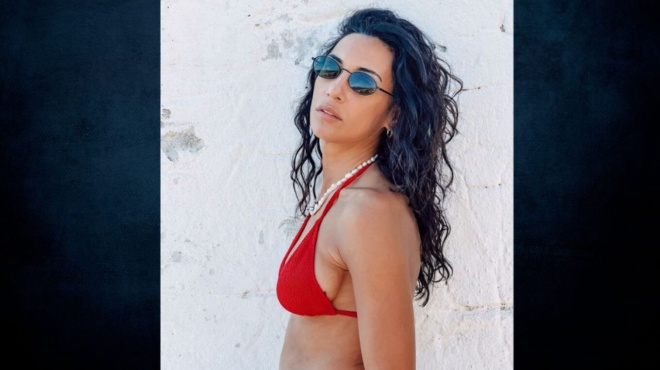 Στα στιγμιότυπα ποζάρει φορώντας ένα κόκκινο μπικίνι και γυαλιά ηλίου, με ένα παρεό δεμένο στη μέση της.