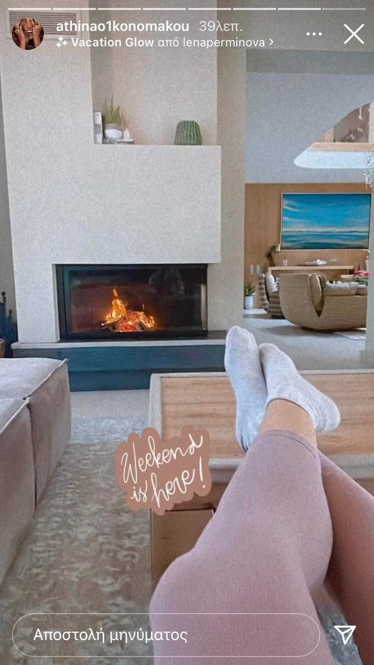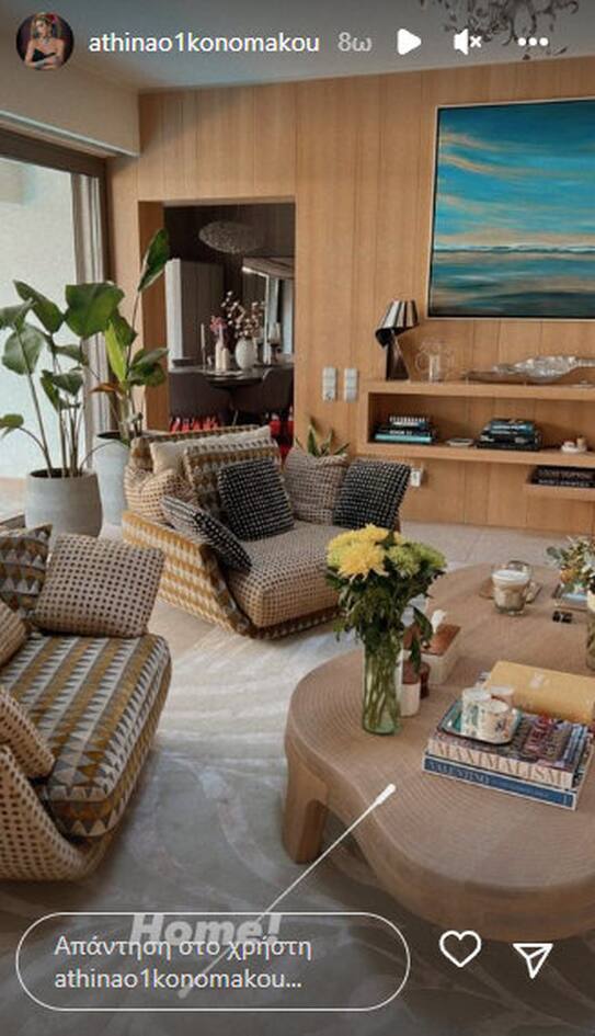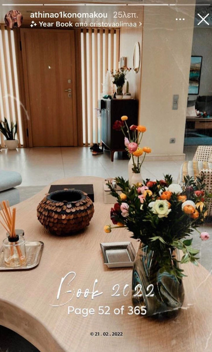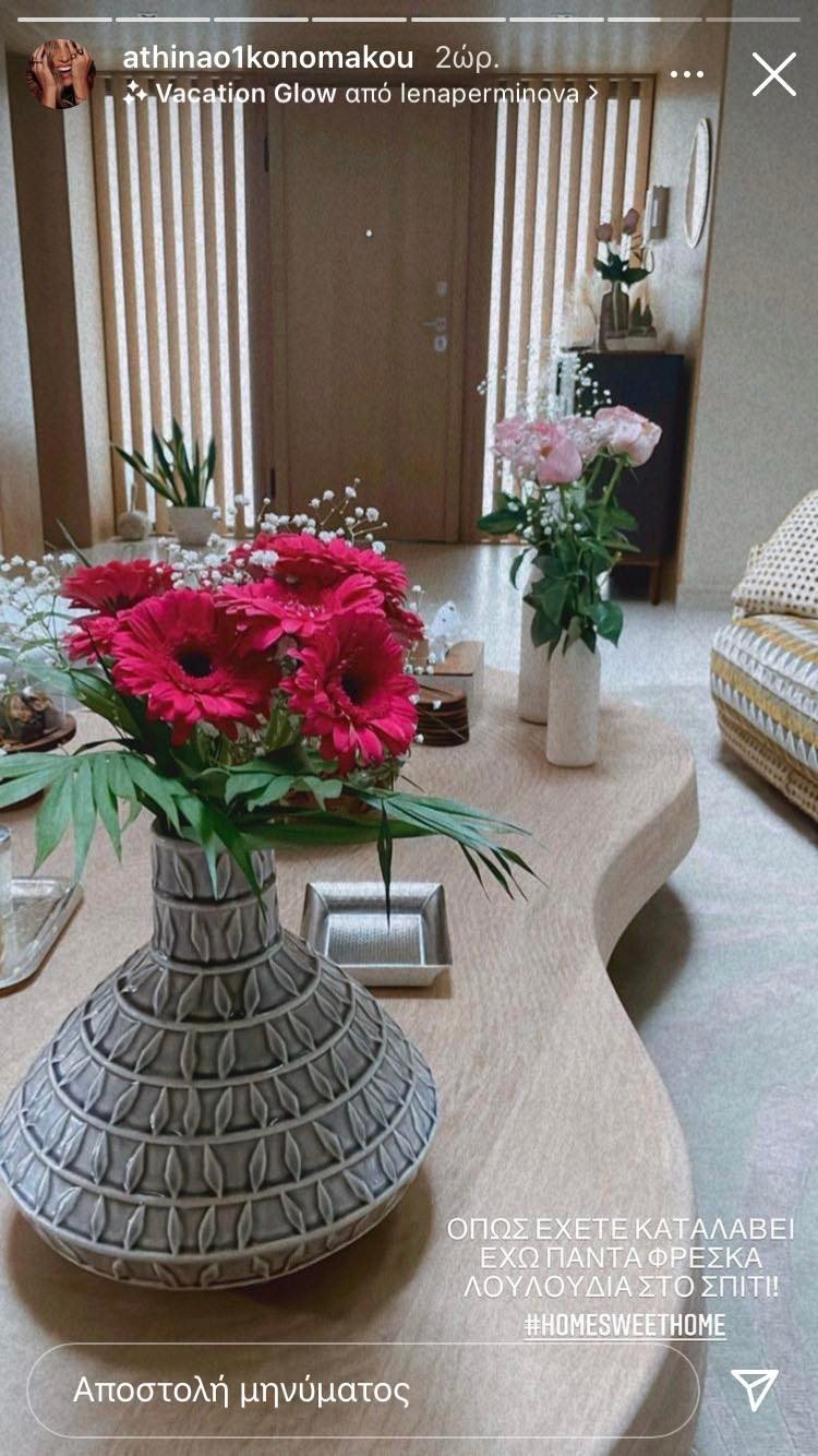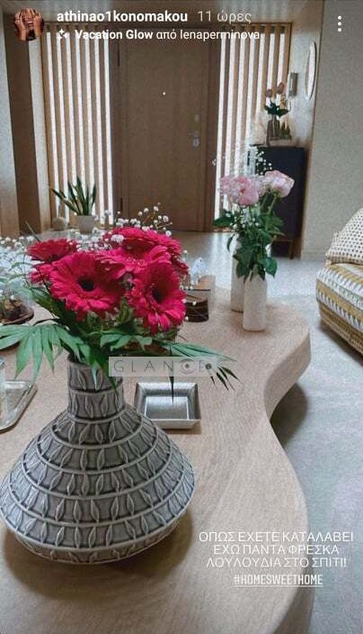 Παράλληλα, φαίνεται ότι η Αθηνά Οικονομάκου λατρεύει τα λουλούδια, αφού όπως είχε γράψει έχει πάντα φρέσκα άνθη στο σπίτι της. Επιπλέον τον χώρο κοσμεί ένα μοντέρνο τζάκι που δίνει την απόλυτη ζεστασιά.