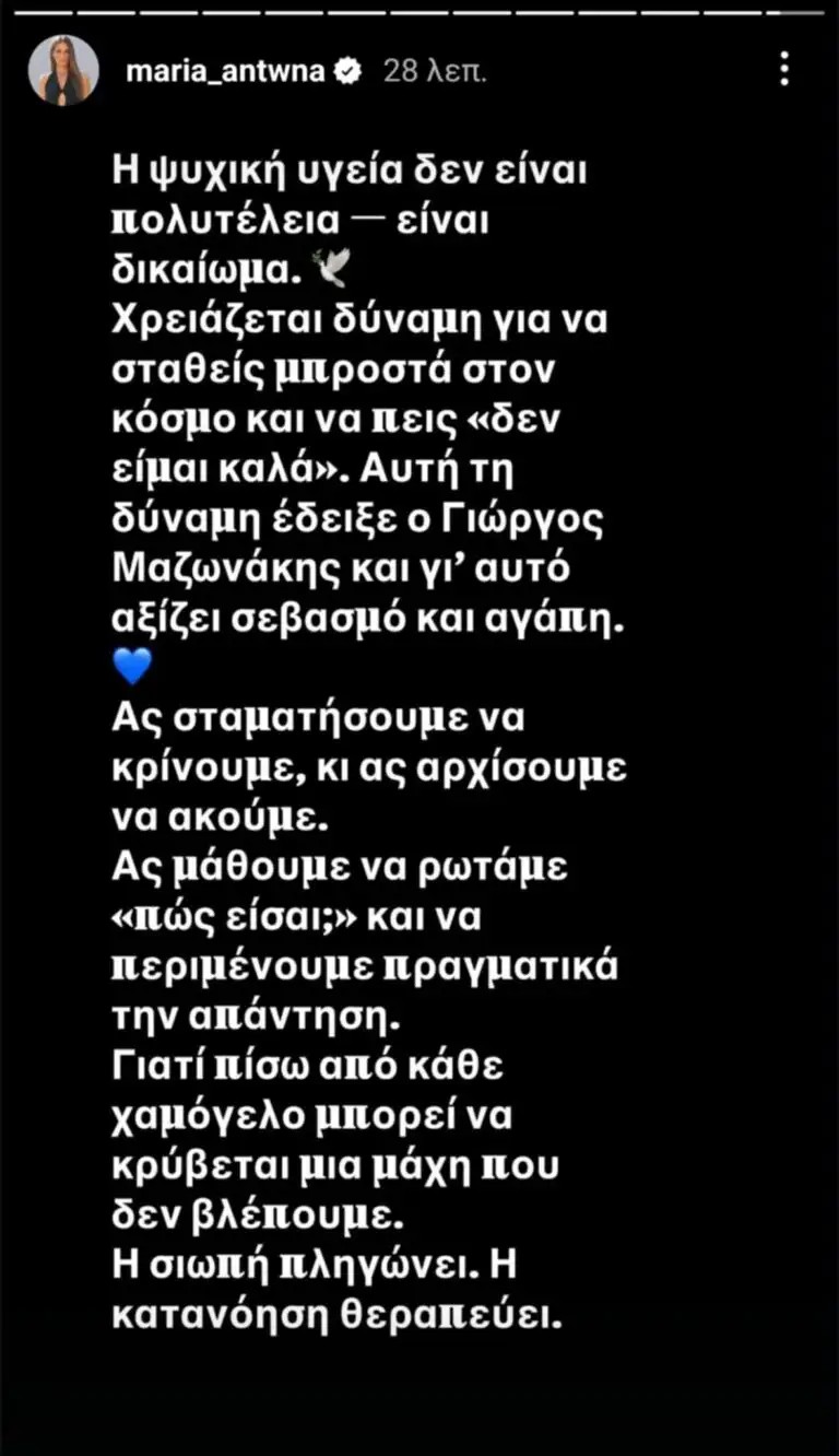 «Η ψυχική υγεία δεν είναι πολυτέλεια — είναι δικαίωμα. Χρειάζεται δύναμη για να σταθείς μπροστά στον κόσμο και να πεις «δεν είμαι καλά». Αυτή τη δύναμη έδειξε ο Γιώργος Μαζωνάκης και γι’ αυτό αξίζει σεβασμό και αγάπη. Ας σταματήσουμε να κρίνουμε, κι ας αρχίσουμε να ακούμε. Ας μάθουμε να ρωτάμε «πώς είσαι;» και να περιμένουμε πραγματικά την απάντηση. Γιατί πίσω από κάθε χαμόγελο μπορεί να κρύβεται μια μάχη που δεν βλέπουμε. Η σιωπή πληγώνει. Η κατανόηση θεραπεύει» γράφει η Μαρία Αντωνά.