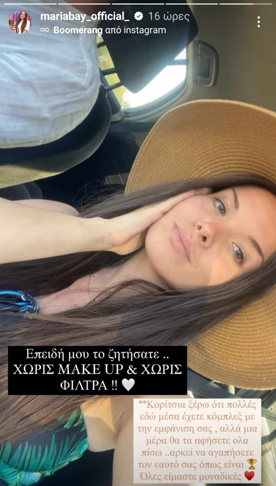 Φαίνεται πως πλέον η Μαρία Μπέη έχει αγκαλιάσει περισσότερο την εικόνα της και έχει αγαπήσει πιο πολύ τον εαυτό της, γι’ αυτό και δημοσιεύει πιο φυσικές φωτογραφίες της. Άλλωστε, στο story που δημοσίευσε για χάρη των followers της από την παραλία, η ίδια πέρα από το ότι δεν υπήρχε κάποιο φίλτρο στην εικόνα της ή ίχνος make up έγραψε και τα εξής: «Κορίτσια ξέρω ότι πολλές εδώ μέσα έχετε κόμπλεξ με την εμφάνισή σας, αλλά μια μέρα θα τα αφήσετε πίσω…αρκεί να αγαπήσετε τον εαυτό σας όπως είναι. Όλες είμαστε μοναδικές», θέλοντας να δώσει το παράδειγμα και σε άλλα νεαρά κορίτσια να αγαπήσουν τον εαυτό τους με τις όποιες ατέλειές του και πως το πιο φυσικό είναι τελικά και το πιο ωραίο.