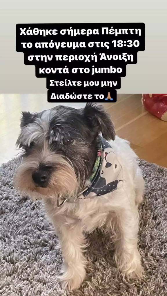 Το πρώην ζευγάρι που διατηρεί άψογες σχέσεις, έχασε τον αγαπημένο τους σκύλο, τη «Λώρα» στην περιοχή της Άνοιξης. Αμέσως, ανέβασαν σχετική ανάρτηση σε περίπτωση που κάποιος το βρει να επικοινωνήσει μαζί τους.