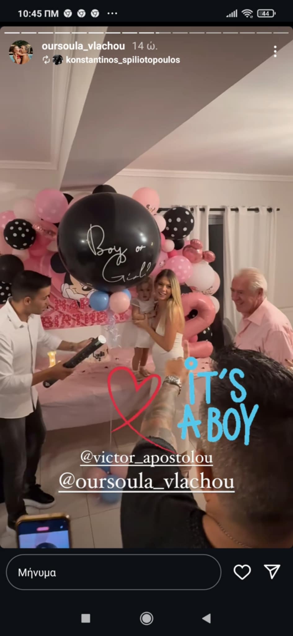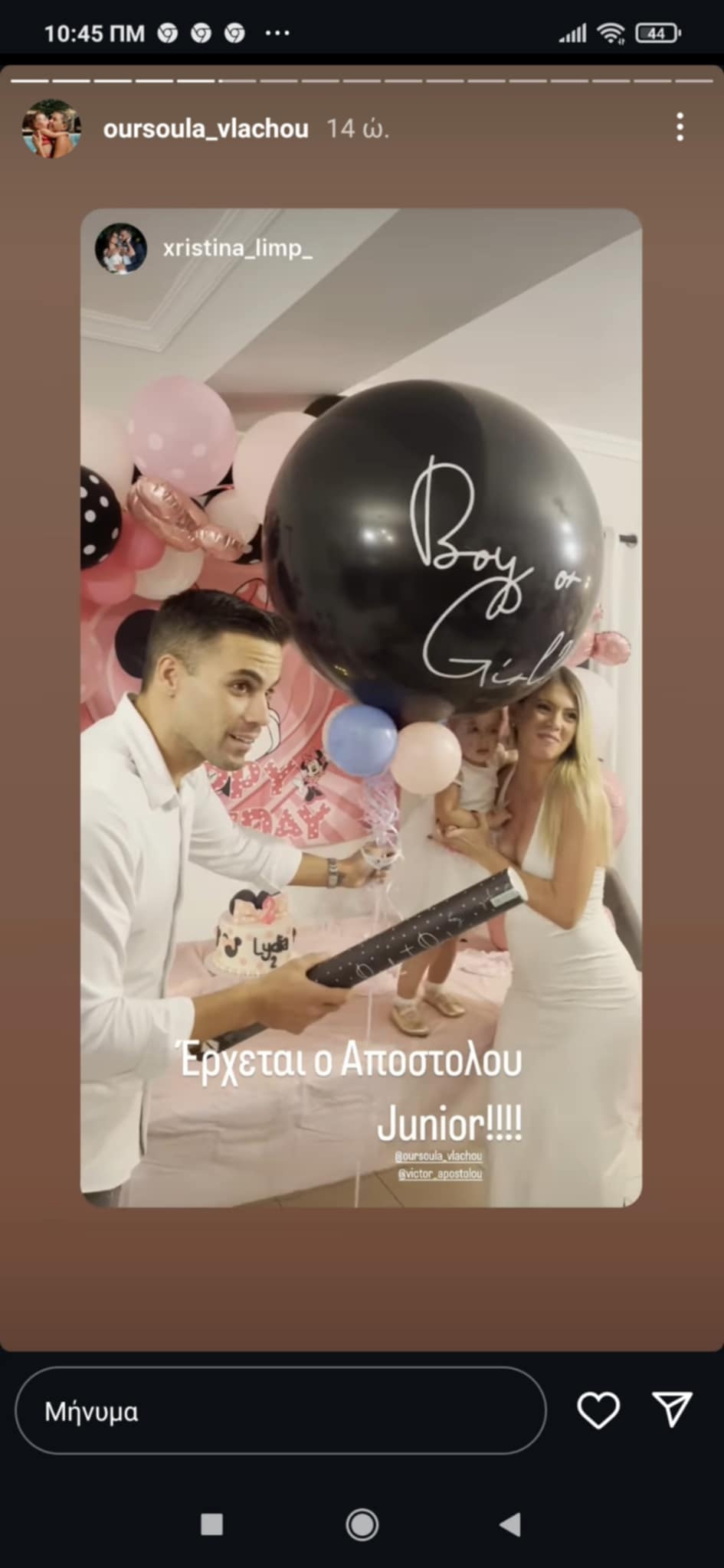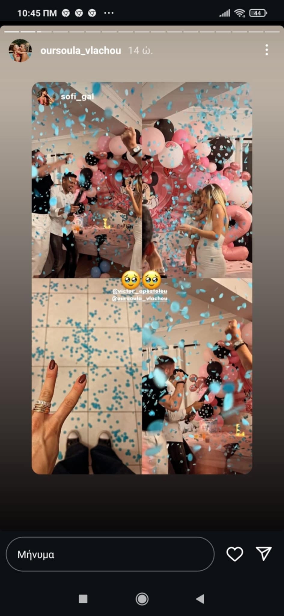 Να σας θυμίσουμε ότι το ζευγάρι είχε επιλέξει την ημέρα των γενεθλίων της κόρης του να κάνουν και το gender reveal πάρτι στο οποίο παρευρέθηκαν οι γονείς τους και καλοί τους φίλοι στο οποίο έμαθαν όλοι ότι έρχεται ο Αποστόλου Junior.