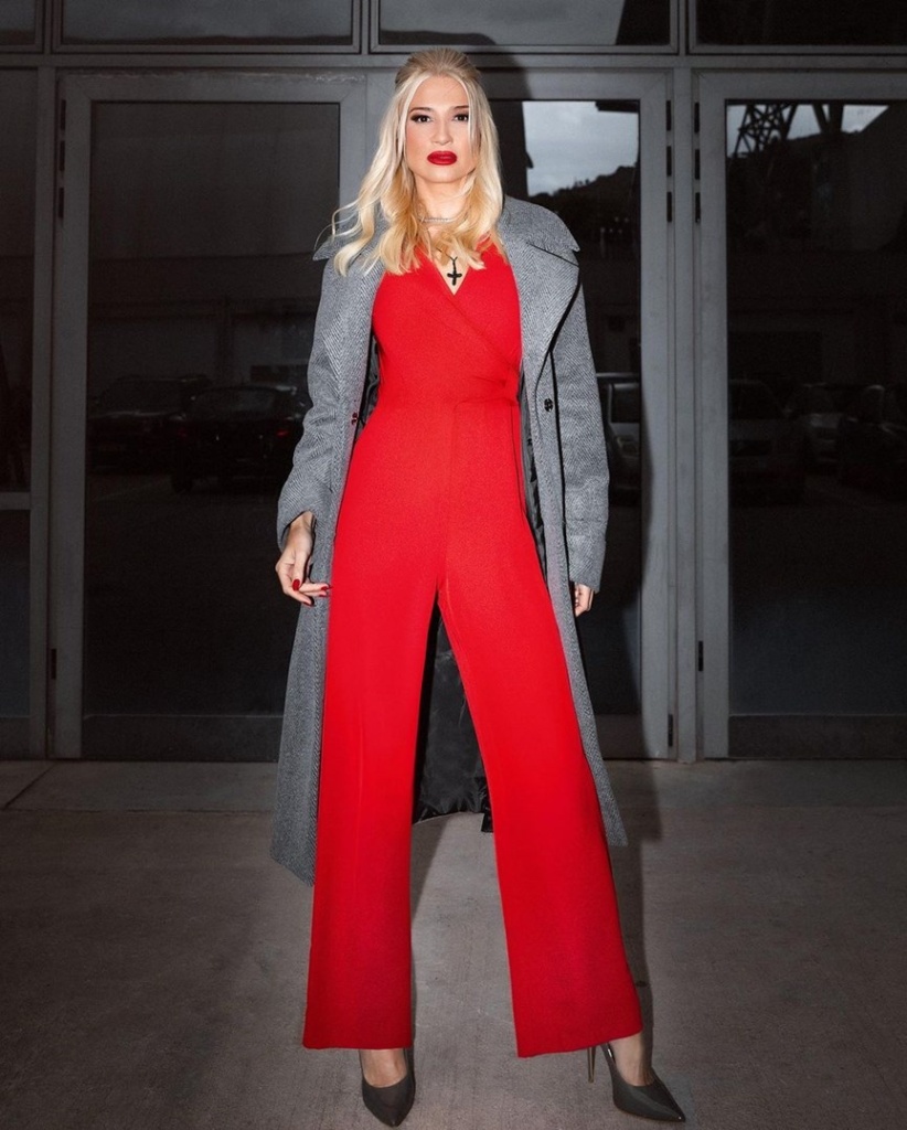 Η παρουσιάστρια, εμφανίστηκε με μια ολόσωμη φόρμα σε κόκκινο χρώμα, ό,τι πιο γιορτινό προφανώς, με κρουαζέ σχέδιο στο πάνω μέρος το οποίο μαζεύει οπτικά υπέροχα και πολύ έξυπνα την μέση σου και τη συνδύασε με μαύρες γόβες. Η Φαίη Σκορδά ολοκλήρωσε το σύνολό της με την ολόσωμη φόρμα της με ένα γκρι παλτό, αλλά εσύ μπορείς να βάλεις και μια μαύρη γούνα για ένα ακόμα πιο grande σύνολο.