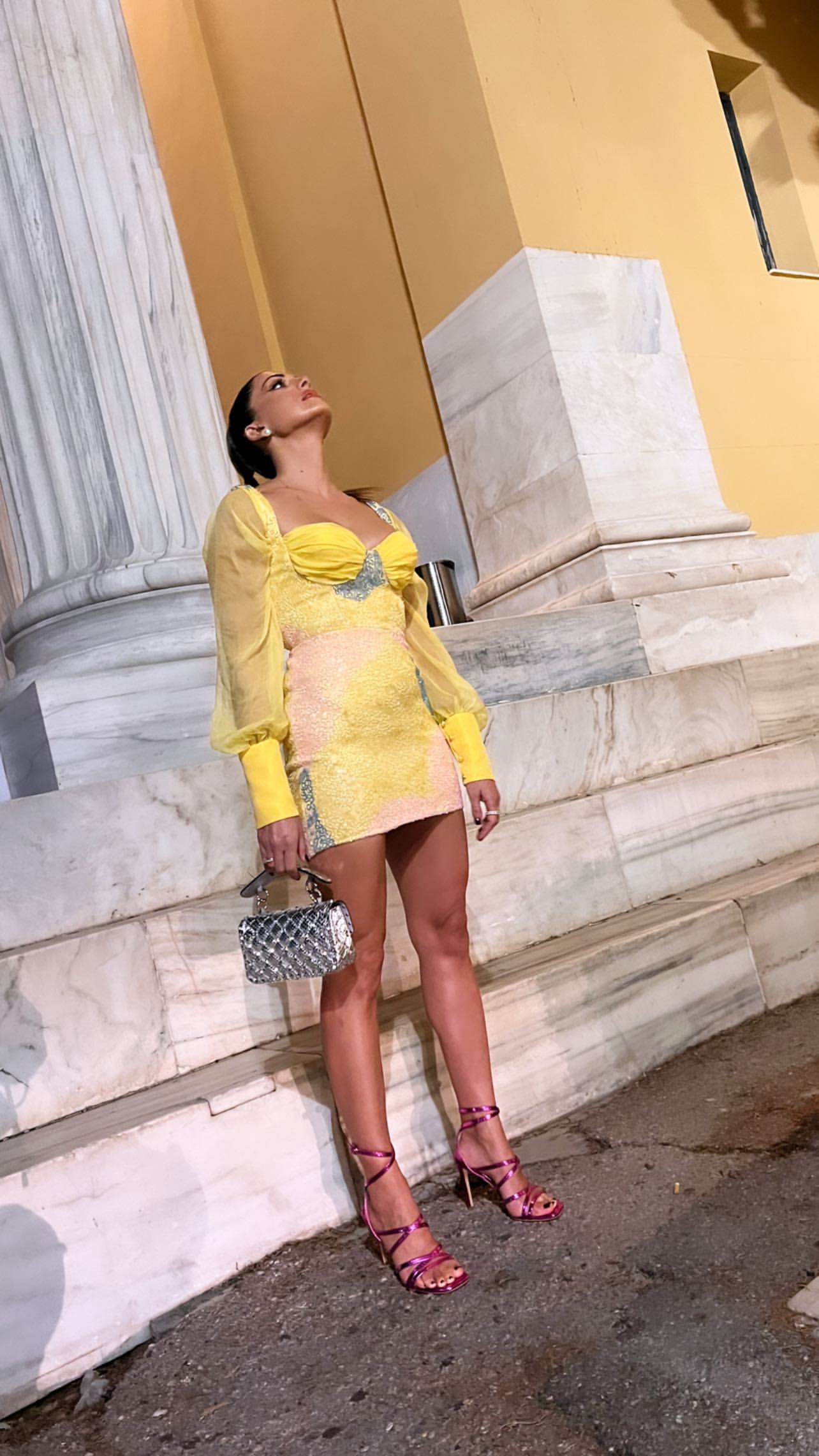 Η 39χρονη παρουσιάστρια, φόρεσε ένα σούπερ μίνι κίτρινο φόρεμα με ροζ και ασημί λεπτομέρειες, διάφανα μανίκια και τονισμένο μπούστο, το οποίο συνδύασε με ψηλοτάκουνα φούξια πέδιλα, διακριτικά κοσμήματα και metallic τσάντα με υφή καπιτονέ.