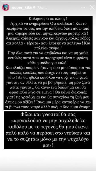 «Καλησπέρα σε όλους. Αρχικά να ενημερώσω ότι απέβαλα! Και το περίμενα να σας πω την αλήθεια διότι πίσω από μια κάμερα εδώ και μήνες περνάω μαρτυρικά. Άπειρες κρίσεις πανικού και άγχους, πολύς φόβος και πολλά τέρατα που έπρεπε να παλέψω. Και παλεύω ακόμα. Παρ’ όλα αυτά για να μπορέσω να επιβιώσω και να μη χαθώ εντελώς, αυτό που με παρηγορεί είναι η φράση “κάθε εμπόδιο για καλό”…» είχε γράψει η Σούπερ Κική στον προσωπικό της λογαριασμό στο Instagram.