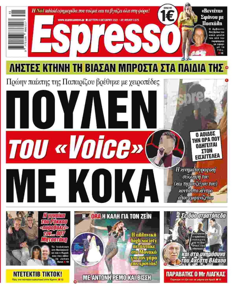 Από την έρευνα διαπιστώθηκε ότι το ένα άτομο, ένας 25χρονος, είχε κρυμμένα στο εσώρουχό του 11,6 γραμμάρια κοκαΐνη, ενώ το άλλο, ένας 23χρονος, κατείχε 2.655 ευρώ, καθώς και το κλειδί ενός κόκκινου VW Tiguan, το οποίο, όπως προέκυψε, είναι ιδιοκτησίας της συζύγου του τραγουδιστή.