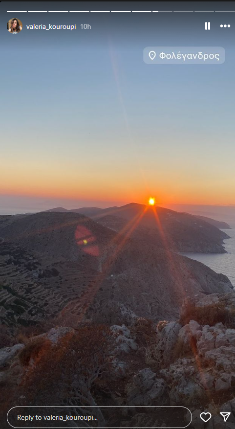 Η ηθοποιός, η οποία είναι ιδιαίτερα ενεργή στο Instagram, δημοσιεύει φωτογραφίες από τη Φολέγανδρο, όπου βρίσκεται με τον αγαπημένο της, δείχνοντας τόσο τα όμορφα τοπία του νησιού, όσο και τις βουτιές της στη θάλασσα.