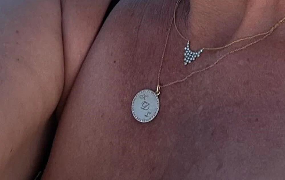 Μια ιδιαίτερη λεπτομέρεια που τράβηξε την προσοχή στη φωτογραφία είναι τα δύο χρυσά κοσμήματα που διακοσμούν τον λαιμό της. Το ένα από αυτά είναι ένα μενταγιόν με ιδιαίτερη συναισθηματική αξία, καθώς φέρει τα αρχικά του συζύγου της, Κώστα, και του γιου τους, Δήμου, αποτυπώνοντας την αφοσίωση της στην οικογένεια της.