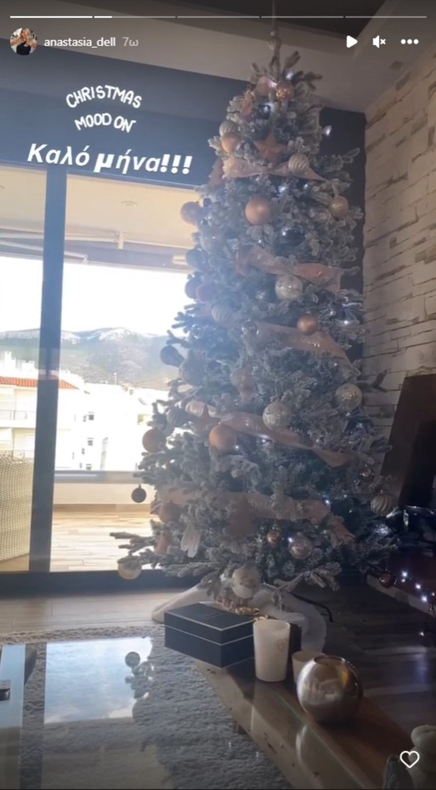 Όπως θα δείτε, το δέντρο του ζευγαριού φτάνει σχεδόν μέχρι το ταβάνι και έχει στολιστεί με χρυσά και ασημένια στολίδια. Στο εν λόγω στιγμιότυπο, πέρα από το δέντρο, βλέπουμε και μια γωνιά του σαλονιού του ζευγαριού, που είναι εντυπωσιακή, όπως επίσης και τη θέα από το μπαλκόνι τους.