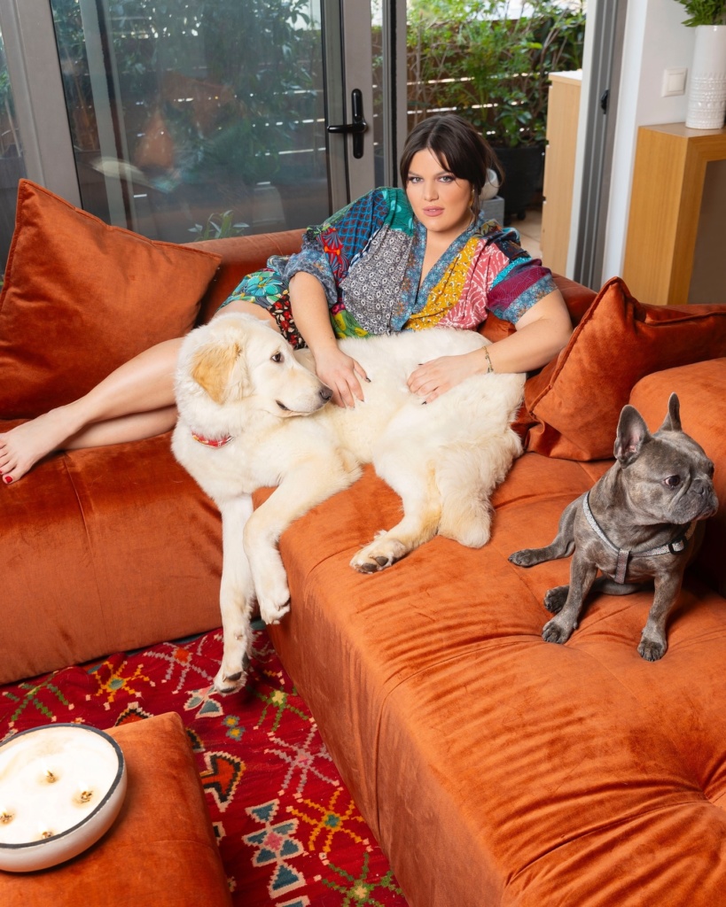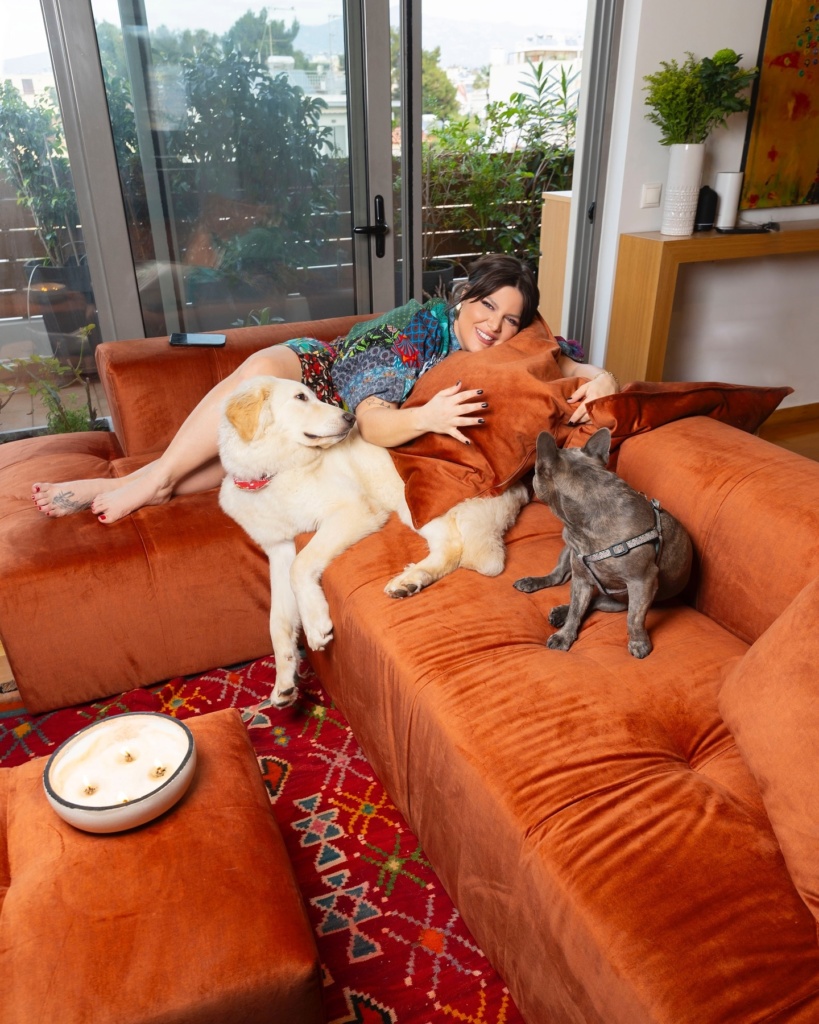 Στις φωτογραφίες που θα δεις στη gallery τον καναπέ απολαμβάνει η ίδια παρέα με τους τετράποδους φίλους της και στην ανάρτησή της, αναρωτιέται: «Δεν ξέρω ποιος χαίρεται περισσότερο τον καινούριο καναπέ.