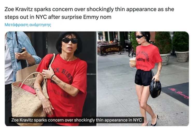 Έντονη ανησυχία έχει προκαλέσει στους θαυμαστές της η πρόσφατη εμφάνιση της Zoe Kravitz, η οποία εθεάθη στη Νέα Υόρκη με εξαιρετικά αδύνατη σιλουέτα, γεγονός που πυροδότησε πλήθος αντιδράσεων στα social media.