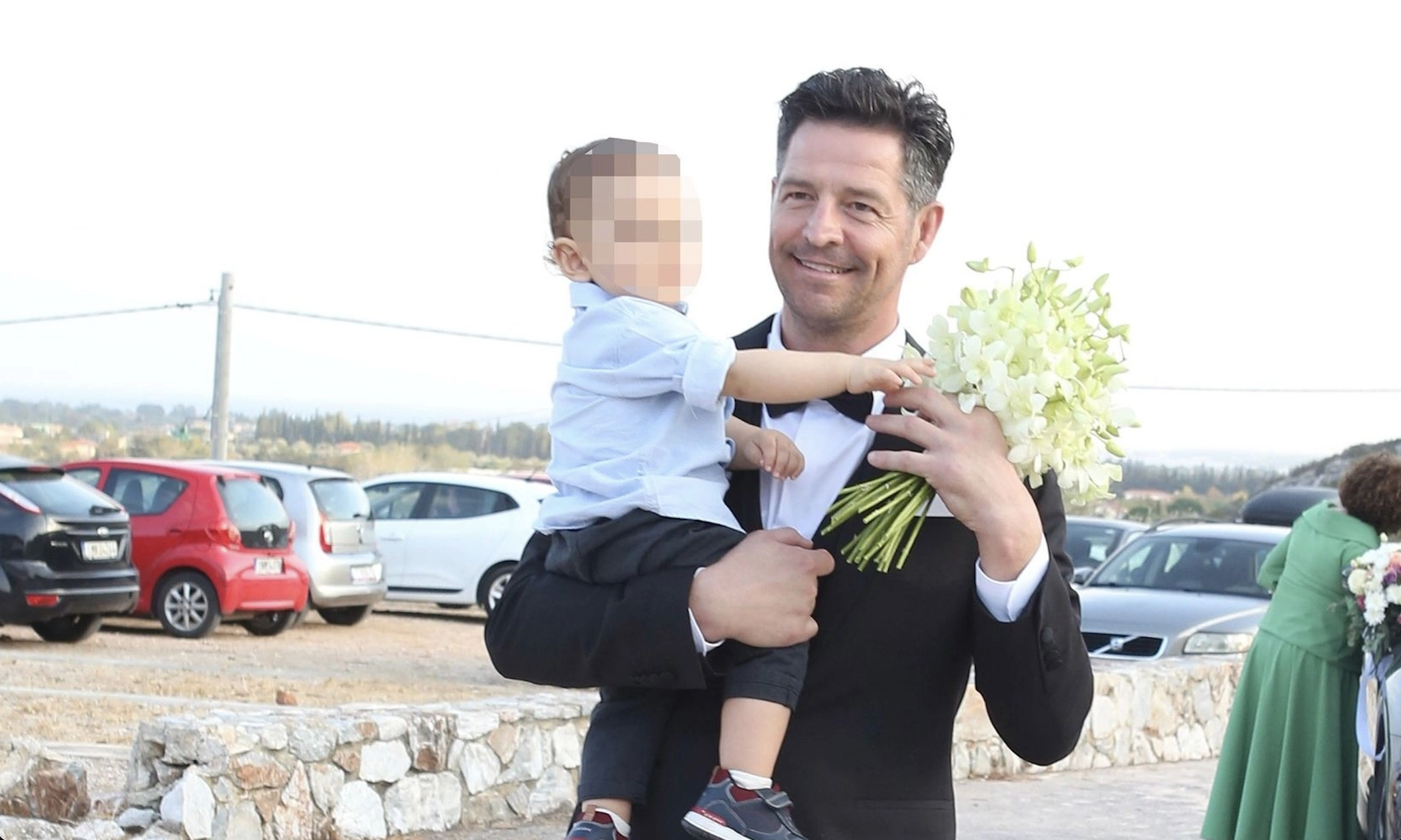 Ο γαμπρός, Απόστολος Ρουβάς, έφτασε στην εκκλησία κρατώντας στην αγκαλιά του τον γιο τους, ενώ λίγο αργότερα εμφανίστηκε η εντυπωσιακή νύφη, συνοδευόμενη από τον πατέρα και τον αδελφό της.