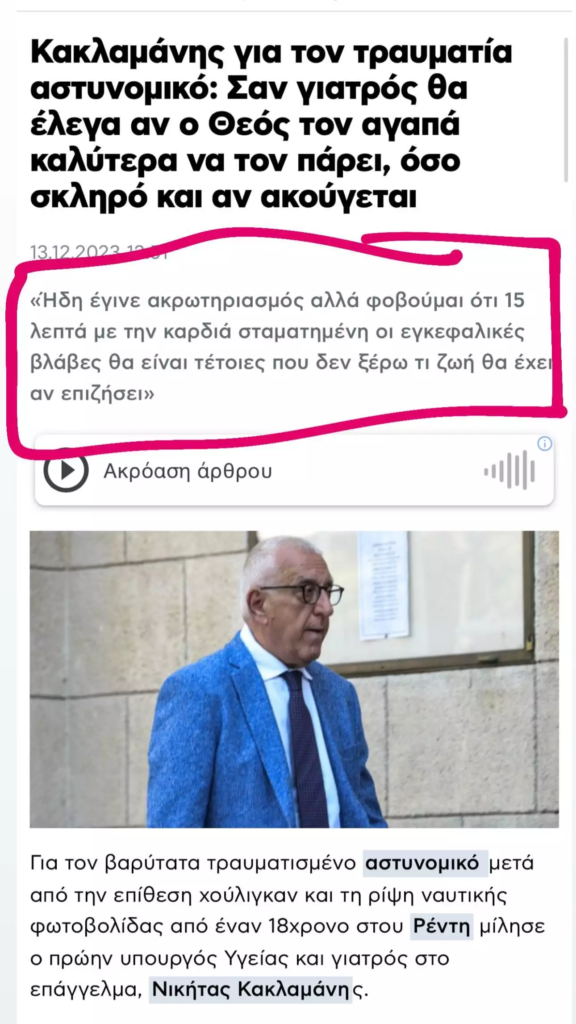 «Δεν ξέρω τι να ευχηθεί κανείς γι’ αυτό το παιδί. Σαν γιατρός θα έλεγα ότι αν ο Θεός τον αγαπάει, καλύτερα να τον πάρει, όσο σκληρό κι αν ακούγεται αυτό από το στόμα ενός γιατρού. Ήδη έγινε ακρωτηριασμός αλλά φοβάμαι ότι οι εγκεφαλικές βλάβες θα είναι τέτοιες που δε ξέρω τι ζωή θα έχει, αν επιζήσει, γιατί η καρδιά του είχε σταματήσει 15 λεπτά. Όσο σκληρό κι αν είναι αυτό για την οικογένειά του. Σκεφτείτε τι θα είχε γίνει αν δεν ήταν ο αστυνομικός και ήταν ένας πολίτης στη θέση του. Και να είχε φύγει μία φωτοβολίδα κρότου λάμψης από αστυνομικό. Να τα λέμε. Φανταστείτε τι θα είχε συμβεί. Τώρα εντάξει εκφράζουμε ευχές, ο κόσμος, η πολιτεία αλλά δεν είδα και καμιά διαδήλωση» δήλωσε χαρακτηριστικά ο Νικήτας Κακλαμάνης.