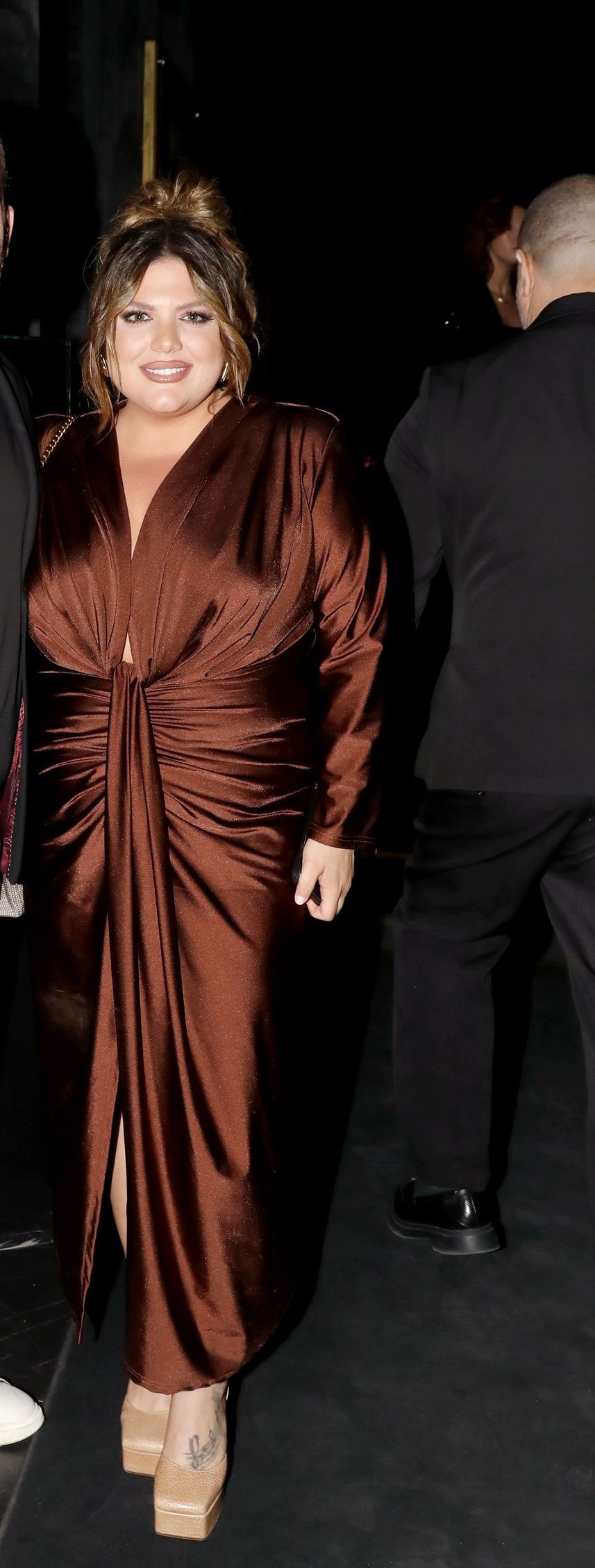 Για τη βραδινή της έξοδο, η Δανάη Μπάρκα επέλεξε ένα μοναδικό σατέν φόρεμα σε καφέ αποχρώσεις, το οποίο αγκάλιαζε τις καμπύλες της. Όπως πάντα, η γνωστή παρουσιάστρια της εκπομπής “Πάμε Δανάη” εντυπωσίασε με την εμφάνισή της. Η Δανάη Μπάρκα απόλαυσε κάθε στιγμή της βραδιάς και, στο τέλος, φωτογραφήθηκε με τη σπουδαία τραγουδίστρια.