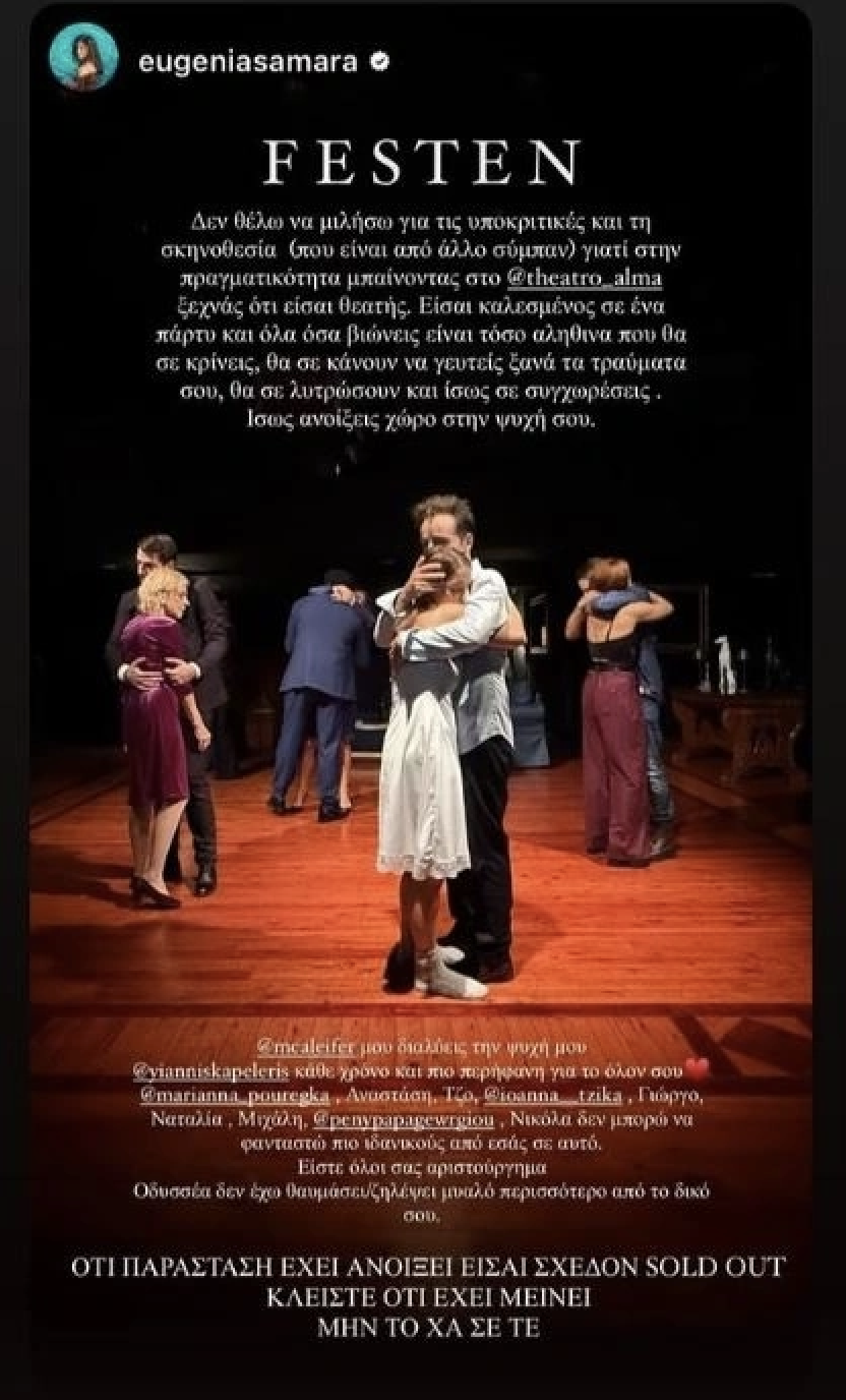 Μάλιστα, η ηθοποιός δεν παρέλειψε να μοιραστεί την εκτίμησή της για τον Οδυσσέα, λίγη ώρα μετά την παρακολούθηση της παράστασης Festen, την οποία σκηνοθετεί ο ίδιος στο Θέατρο Άλμα.