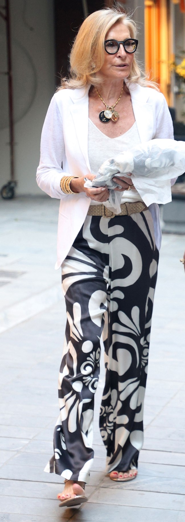 Η μητέρα της φόρεσε μια αέρινη παντελόνα, με σανδάλια, λευκό τοπ και λευκό μπλέιζερ, στο λαιμό της φόρεσε ένα εντυπωσιακό κόσμημα, στο χέρι της πολλά βραχιόλια και κράτησε μια τσάντα με κρόσια.