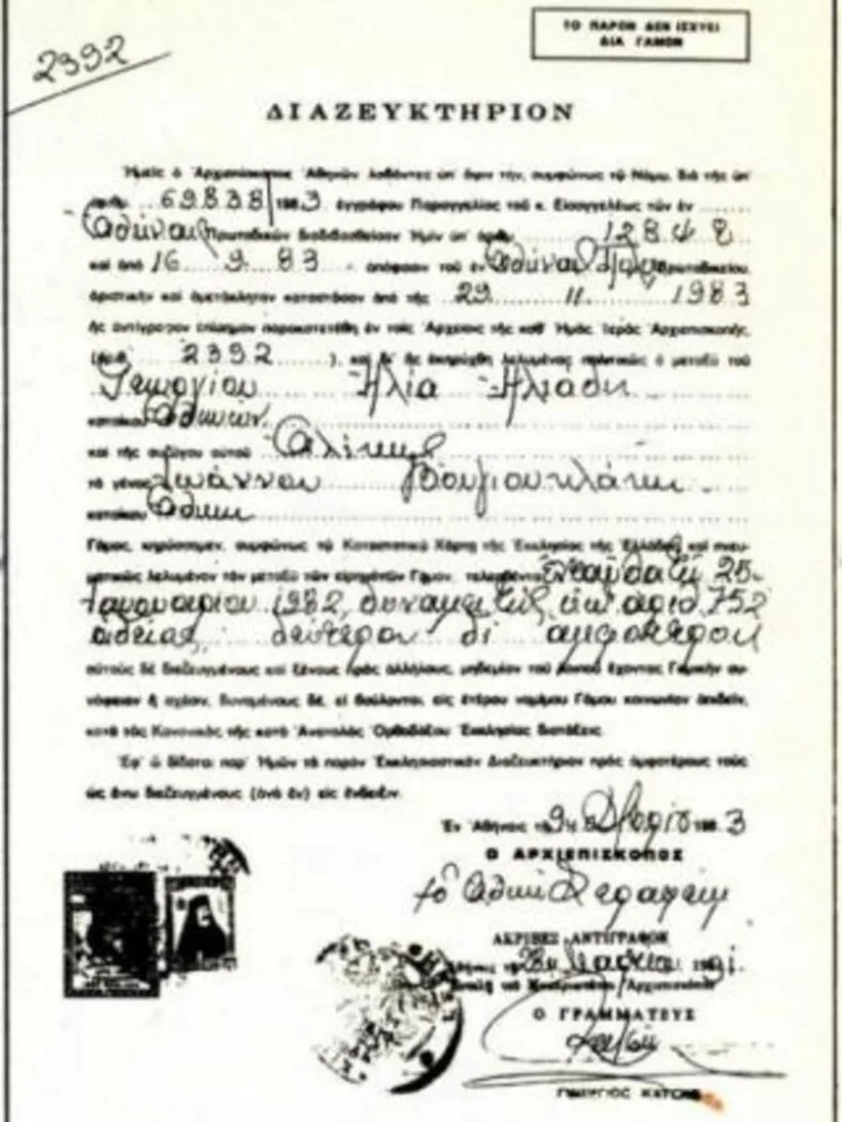 Το διαζευκτήριο, που εξεδόθη στις 9 Δεκεμβρίου του 1983, αναφέρει τα εξής: «Σύμφωνα με τη 12848 απόφαση του πολυμελούς πρωτοδικείου Αθηνών ,ο μεταξύ του Γεωργίου Ηλία Ηλιάδη ,κατοίκου Αθηνών ,και της συζύγου αυτού Αλίκης ,το γένος Ιωάννου Βουγιουκλάκη ,κατοίκου Αθηνών ,ο γάμος εκηρύχθει λελυμένος».