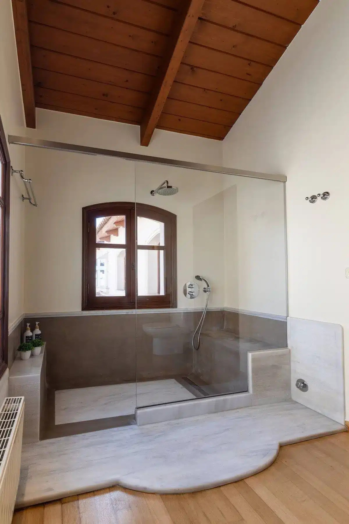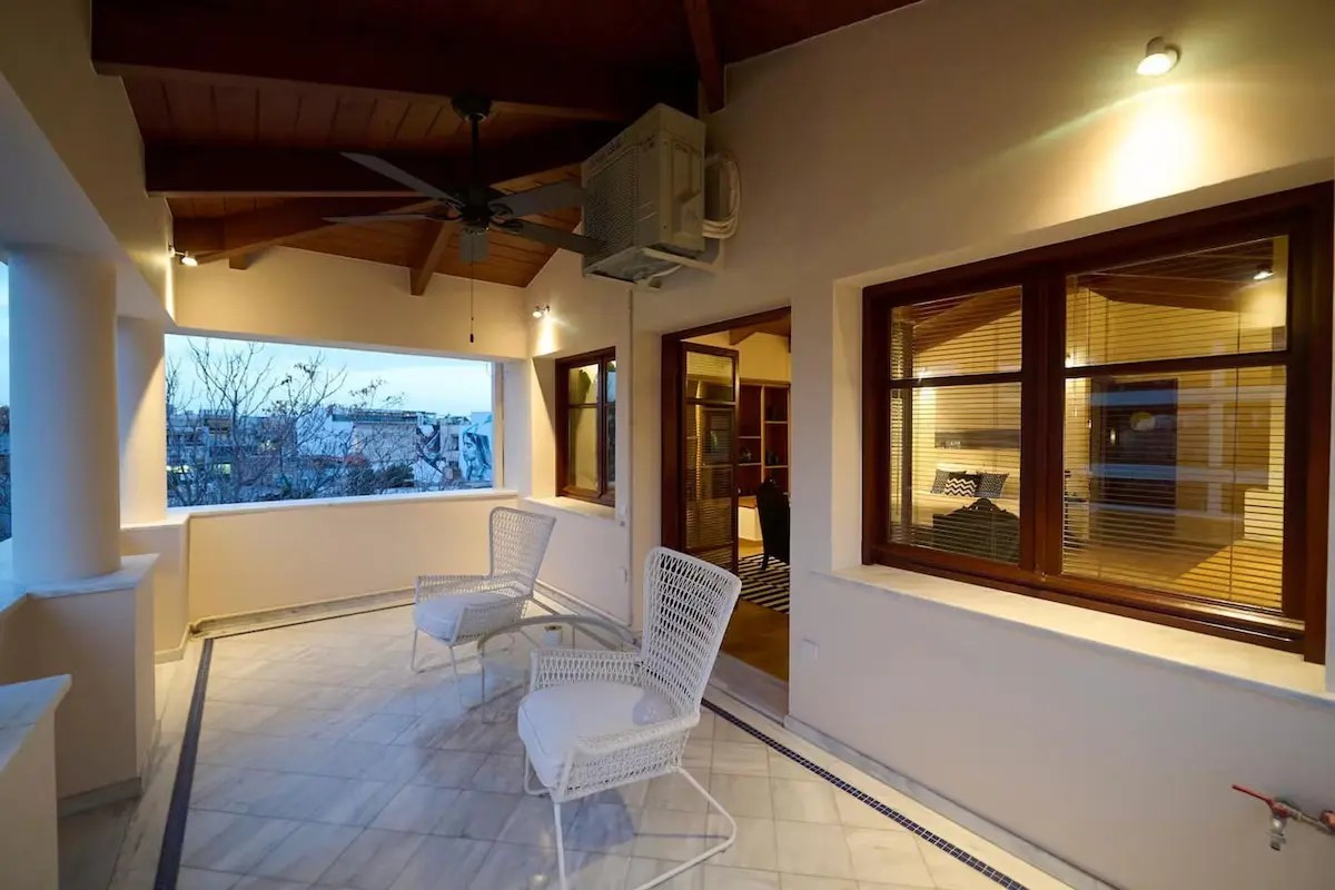 Πρόκειται για μια μονοκατοικία 320 τ.μ., τετραώροφη, που χτίστηκε το 1998. Το εσωτερικό διαθέτει θερμαινόμενη εσωτερική πισίνα, ένα πολυτελές στοιχείο που — ειδικά για το κέντρο της Αθήνας — προσδίδει έναν χαρακτήρα πραγματικής κατοικίας-καταφυγίου. Η σοφίτα με ξύλινη οροφή, τα εμφανή δοκάρια και ένα τζάκι, έδινε την αίσθηση σουίτας σε εξοχικό καταφύγιο — ενώ τα μεγάλα παράθυρα και οι βεράντες της δίνουν απεριόριστη θέα στην Ακρόπολη και στον Λυκαβηττό. Το interior design είχε αναλάβει ομάδα επαγγελματιών (με την επιμέλεια διακόσμησης από εταιρεία design του χώρου), συνδυάζοντας με επιτυχία το μοντέρνο με το κλασικό.