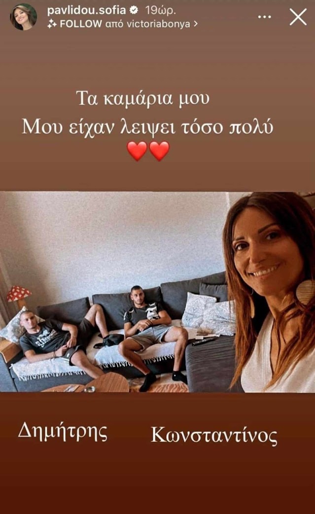 Η Σοφία Παυλίδου θέλησε να μοιραστεί στον προσωπικό της λογαριασμό στο Instagram μια σπάνια φωτογραφία με τους δίδυμους γιους της, Κωνσταντίνο και Δημήτρη, οι οποίοι έχουν μεγαλώσει πολύ. «Τα καμάρια μου. Μου είχαν λείψει τόσο πολύ», έγραψε η Σοφία Παυλίδου στο Instagram.