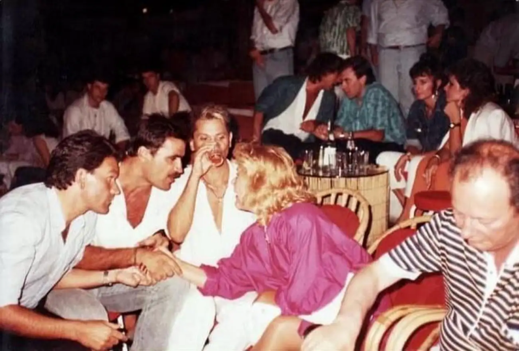 Στη φωτογραφία φαίνεται η κουμπάρα μου και νονά της πρώτης μου συζύγου, η κορυφαία των κορυφαίων, η Μαρινέλλα, ο Δημήτρης Σουλελές, ο επιχειρηματίας και ιδιοκτήτης του «Ειρηνικού», του κορυφαίου κέντρου διασκεδάσεως της εποχής, και αριστερά εγώ.