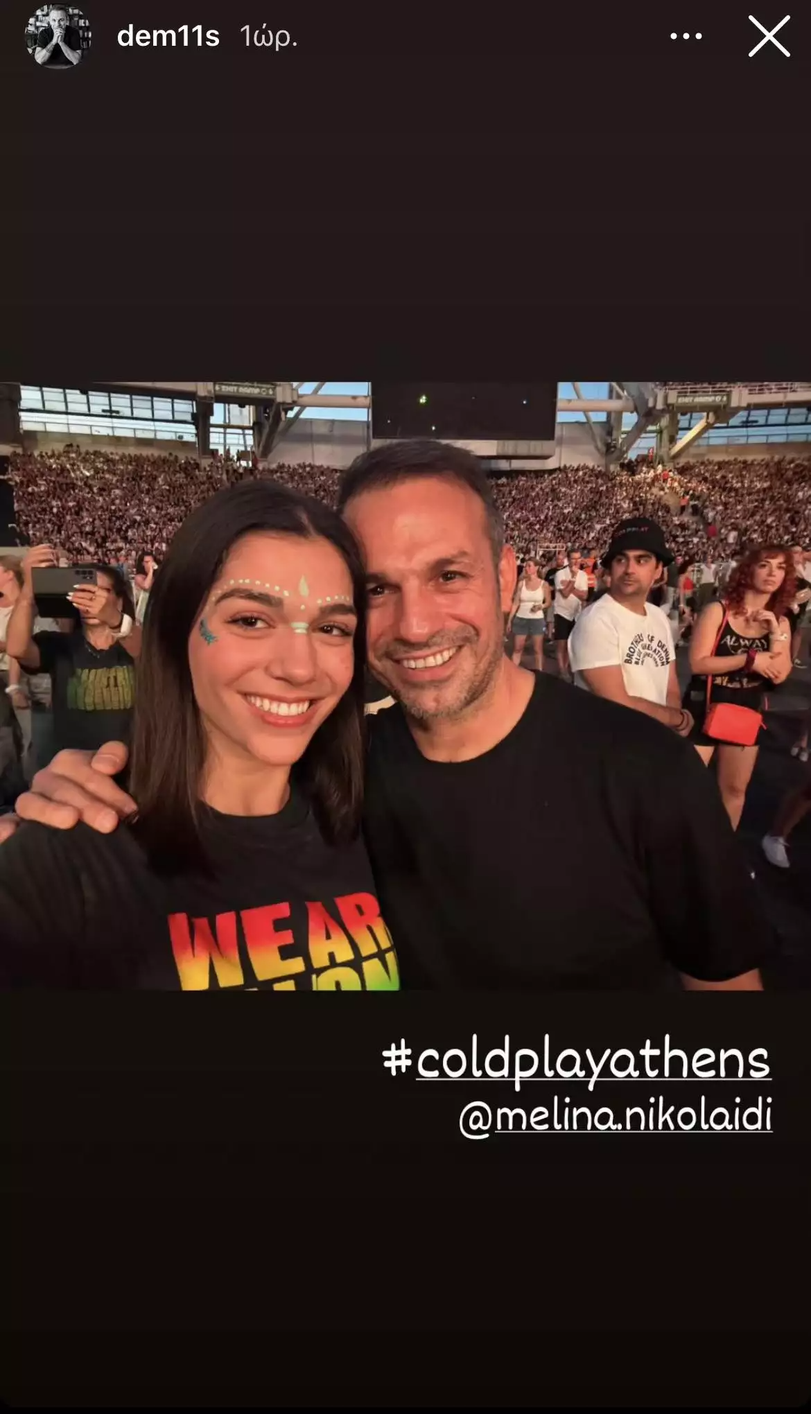 Ειδικότερα, ο παλαίμαχος ποδοσφαιριστής, που τα τελευταία χρόνια έχει τη δική του αθλητική εκπομπή, βρέθηκε χθες, Σάββατο, το βράδυ, στο ΟΑΚΑ, για να παρακολουθήσει τη συναυλία των Coldplay, μαζί με την κόρη του, Μελίνα Νικολαΐδη, την οποία έχει αποκτήσει από τον γάμο του με τη Δέσποινα Βανδή και η σύντροφός του, Αλεξάνδρα Νικολαΐδου, με την οποία είναι μαζί τον τελευταίο χρόνο.