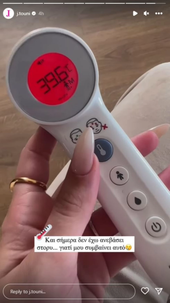 Ωστόσο, η γνωστή influencer και επιχειρηματίας αποκάλυψε σήμερα πως τρεις μέρες μετά την βάφτιση είναι άρρωστη στο σπίτι της. Συγκεκριμένα, η Ιωάννα Τούνη δημοσίευσε μία φωτογραφία που κρατά το θερμόμετρο το οποίο δείχνει πως έχει υψηλό πυρετό 39,6 και γράφει: «Και σήμερα δεν έχω ανεβάσει στορυ γιατί που συμβαίνει αυτό».