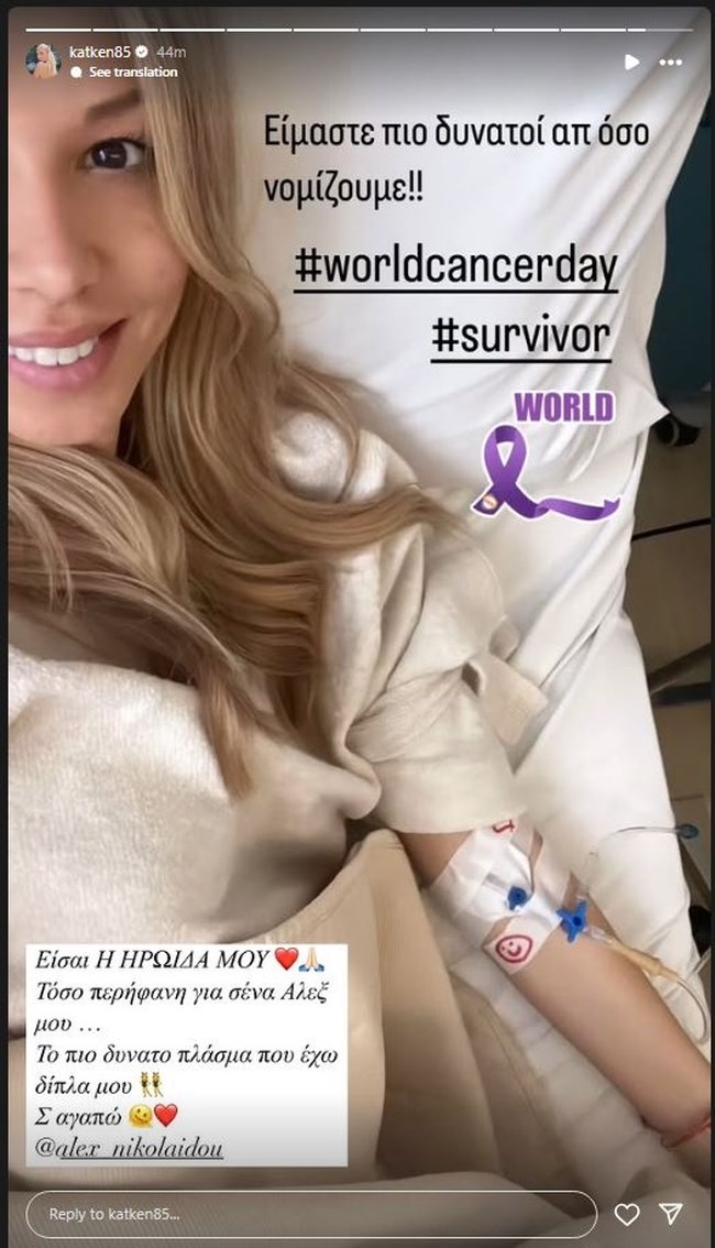 Η Αλεξάνδρα Νικολαΐδου αποκάλυψε χθες Τρίτη 4 Φεβρουαρίου, με αφορμή την Παγκόσμια Ημέρα Κατά του Καρκίνου τη δική της μάχη, ανεβάζοντας μια φωτογραφία από το νοσοκομείο.