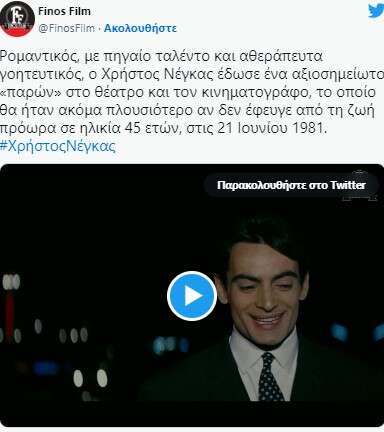 Σαράντα δύο χρόνια συμπληρώθηκαν από τον θάνατο του Χρήστου Νέγκα και η Finos Film θέλησε να τον τιμήσει μέσα από τα social media της δημοσιεύοντας ένα βίντεο γεμάτο σκηνές του.