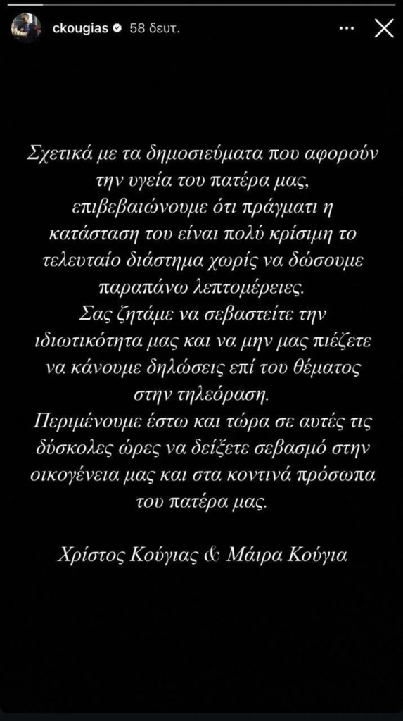 Με μια ανάρτησή τους στα social media τα παιδιά του Αλέξη Κούγια, Χρήστος και Μάϊρα επιβεβαιώνουν ότι η κατάσταση του πατέρα τους είναι πολύ κρίσιμη το τελευταίο χρονικό διάστημα.