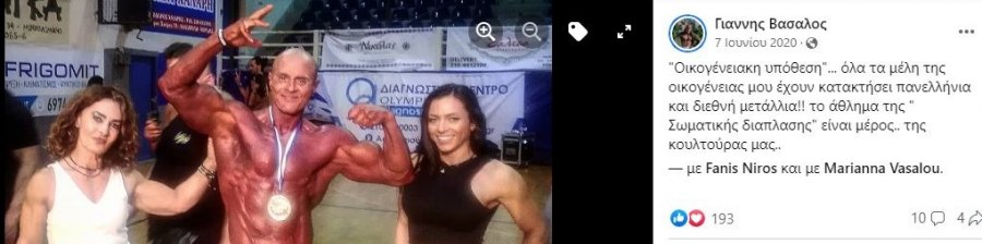 Η οικογένεια του 33χρονου Κωνσταντίνου Βασάλου, που κατάγεται από τη Σίφνο, θα μπορούσε να έχει μία θέση στο βιβλίο Ρεκόρ Γκίνες, καθώς τόσο ο πατέρας του Γιάννης όσο και η θεία του Μαρία αλλά και η μεγαλύτερη αδελφή του Μαριάννα, ασχολούνται επαγγελματικά με το bodybuilding και έχουν κατακτήσει μετάλλια σε αγώνες τόσο στην Ελλάδα όσο και στο εξωτερικό.
