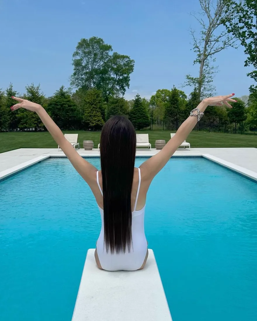 Η σχεδιάστρια νυφικών φορούσε ένα απλό λευκό ολόσωμο μαγιό, με τετράγωνο ντεκολτέ και πόζαρε μπροστά από μια εντυπωσιακή πισίνα.
