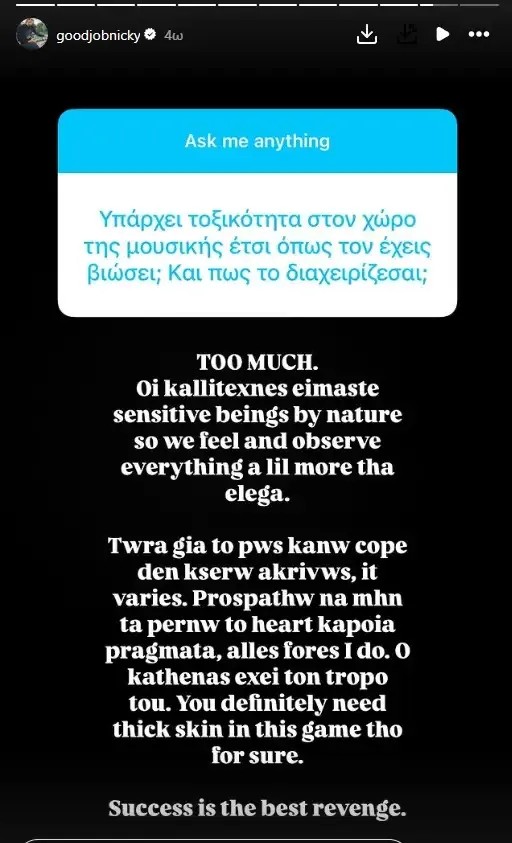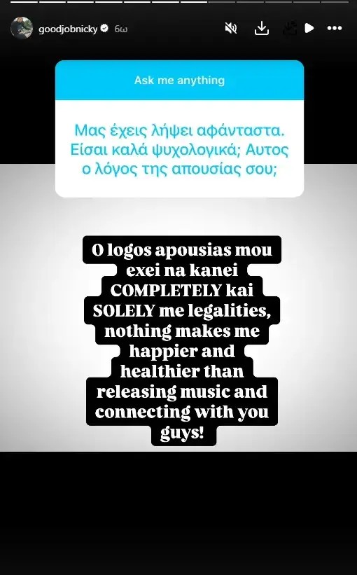 Να απαντήσει για τους λόγους που επέλεξε να μείνει για λίγο εκτός μουσικής θέλησε μέσω ενός Q&A που έκανε στον λογαριασμό του στο instagram ο Good Job Nicky.