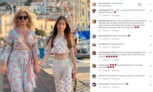 Η Ζήνα Κουτσελίνη μοιράστηκε τη φωτογραφία μέσω του λογαριασμού της στο Instagram και συνόδευσε την ανάρτηση με το σχόλιο “Days like these…” (“Μέρες σαν κι αυτές…”). Στην εικόνα, η μαμά και η κόρη κρατούνται χέρι χέρι, φορώντας εναρμονισμένα ρούχα με φλοράλ μοτίβο. Έτσι προσέθεσαν μια πινελιά ανεμελιάς και χρωματικής αρμονίας στην εικόνα.