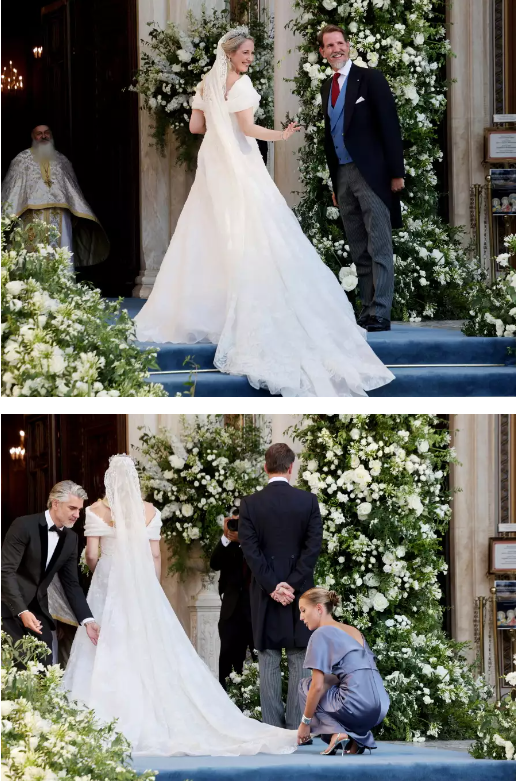 Η Θεοδώρα κατέφθασε στην εκκλησία συνοδευόμενη από τον αδελφό της, Παύλο, φορώντας ένα εκπληκτικό νυφικό της διεθνούς φήμης Ελληνίδας σχεδιάστριας Σήλιας Κριθαριώτη, η οποία είναι αγαπημένη επιλογή της μητέρας της, Άννας-Μαρίας, για τις επίσημες εμφανίσεις της. Η νύφη ολοκλήρωσε το εντυπωσιακό της σύνολο με μια τιάρα από τον οίκο Cartier, η οποία έχει πλούσια ιστορία. Η συγκεκριμένη τιάρα ήταν γαμήλιο δώρο από τον Χεδίβη της Αιγύπτου στην πριγκίπισσα Μαργαρίτα του Connaught, εγγονή της βασίλισσας Βικτωρίας, στο γάμο της με τον Γουσταύο VI της Σουηδίας.